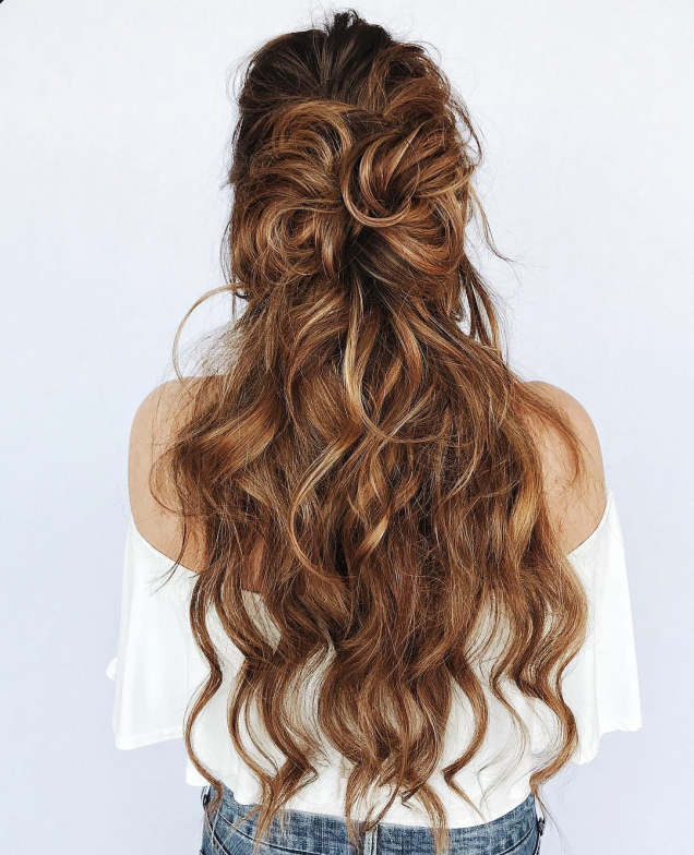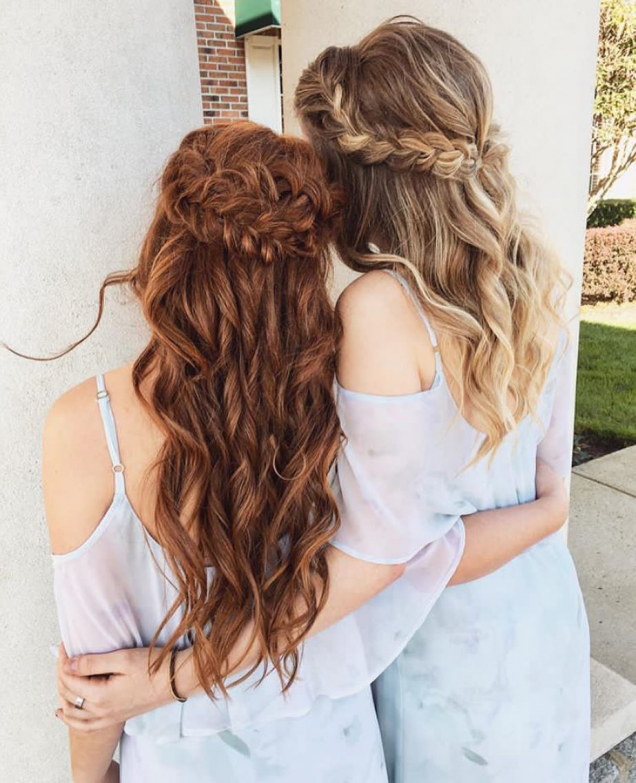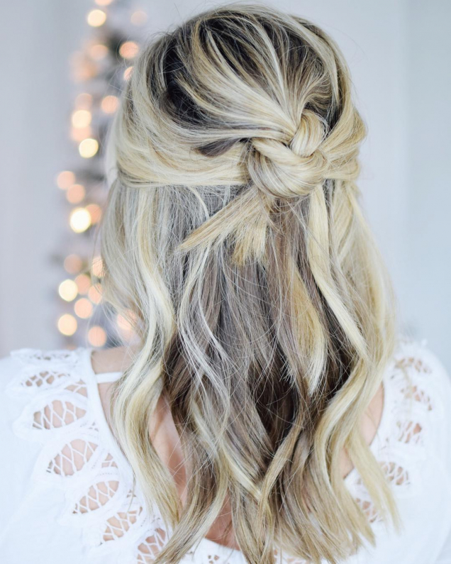 Найпростіший спосіб виглядати по-святковому і без особливих зусиль – це накрутити локони на плойку і сформувати неохайний пучок або заплести дві маленькі коси «рибий хвіст».