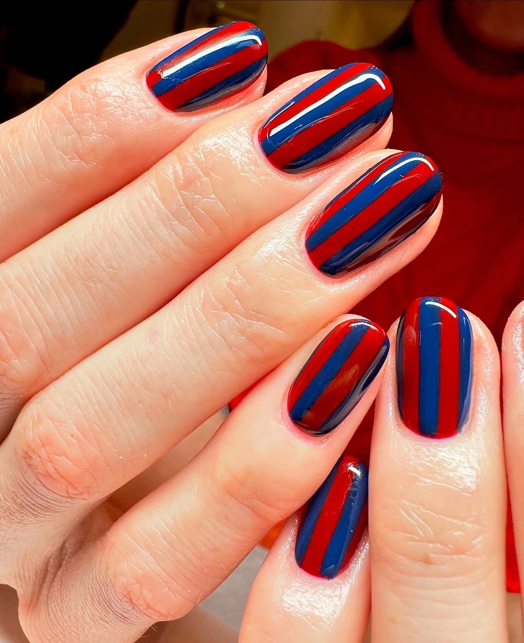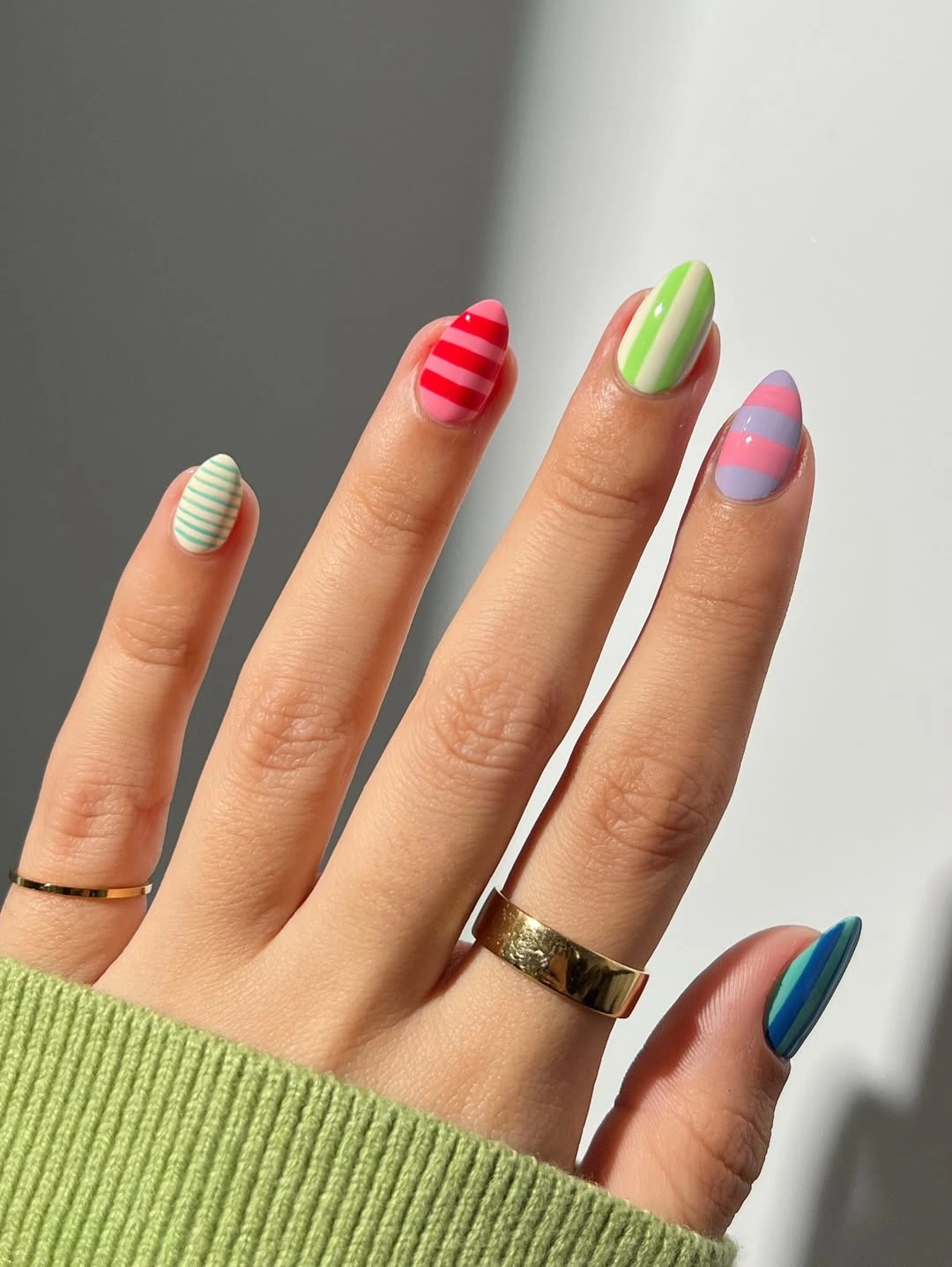 Ще одним із помітних хітів літа 2025 став манікюр у стилі Beach Towel Nails. Він черпає натхнення у пляжних рушниках і парасольках та легкій атмосфері відпочинку біля моря. Яскраві смужки, контрастні відтінки, діагональні лінії та навіть легкі 3D-текстури — все це нагадує класичні пляжні візерунки.