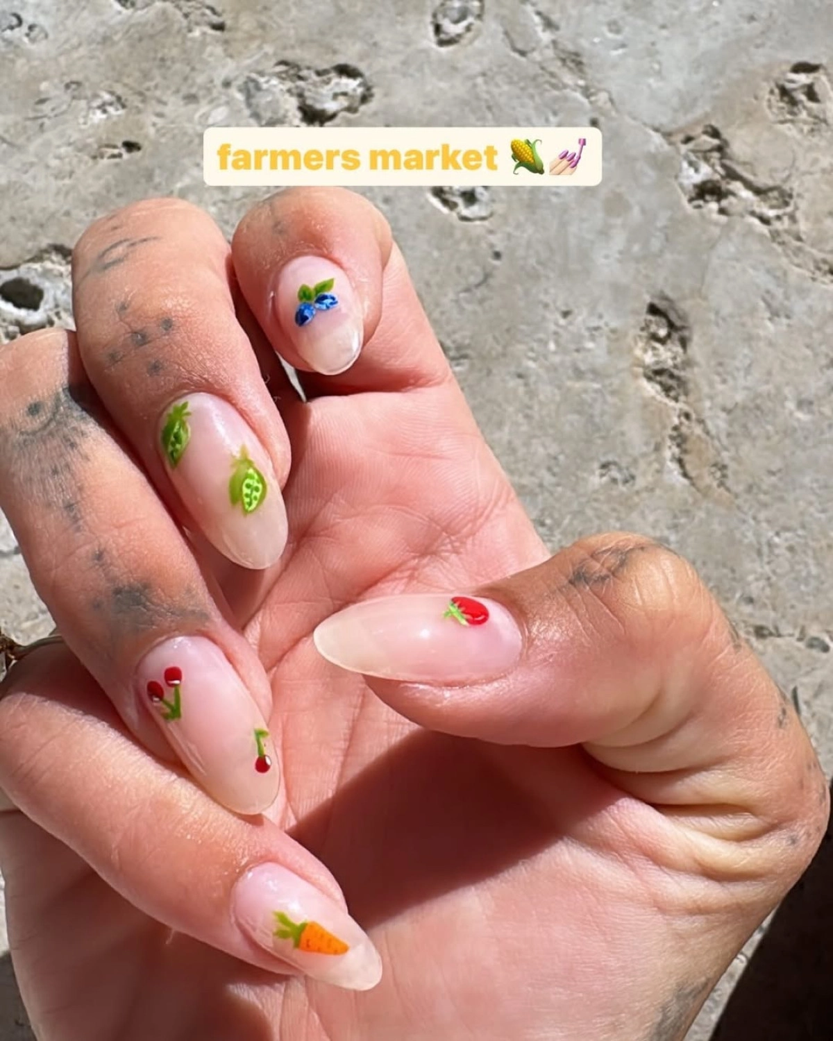 Ще один яскравий літній тренд — манікюр з фруктами та овочами. За даними Spate Data, інтерес до fruit nails за останній рік стрімко набирає обертів: +58% у Google та +222% у TikTok. Цей вибух популярності почався ще торік з образу Гейлі Бібер — її «фермерський манікюр», створений нейл-майстринею Золою Ґанзоригт, став справжнім хітом. Прозора нюдова база з крихітними зображеннями фруктів і овочів задала нову естетику у нейларті: делікатну, грайливу й абсолютно літню.