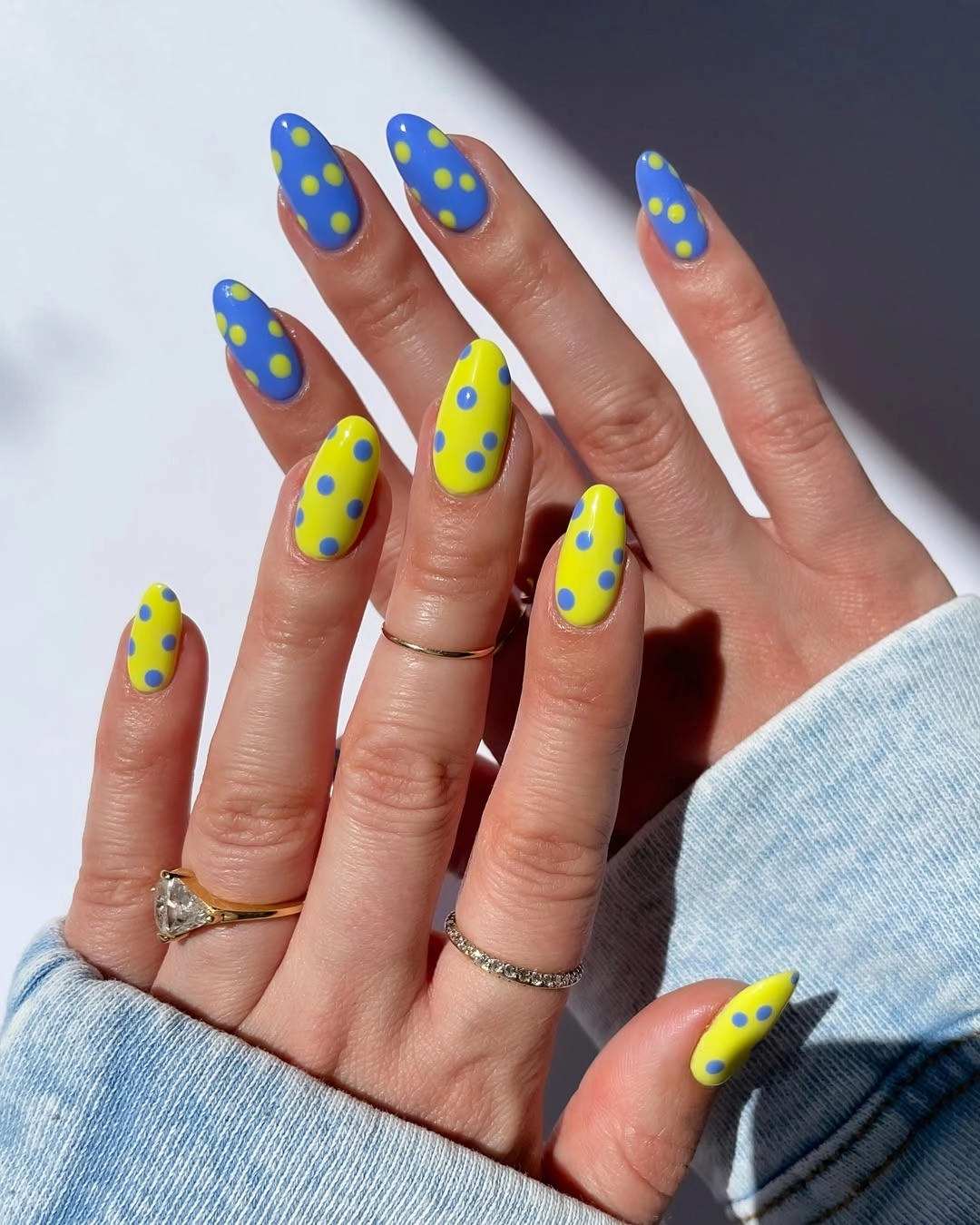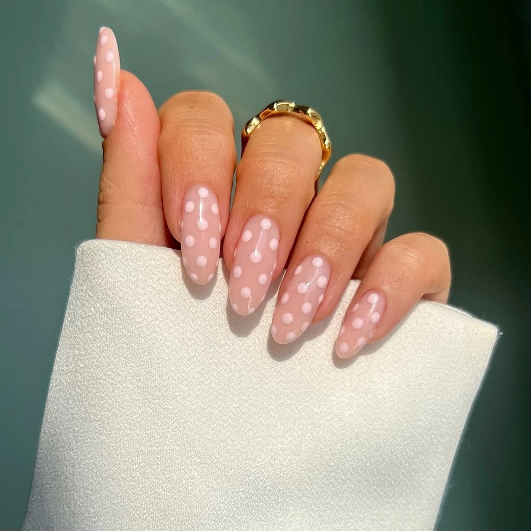 Пастельна база з контрастними крапками, яскраві крапки на прозорому тлі або відтінки в тон одягу — горошок легко адаптується під будь-який образ.
