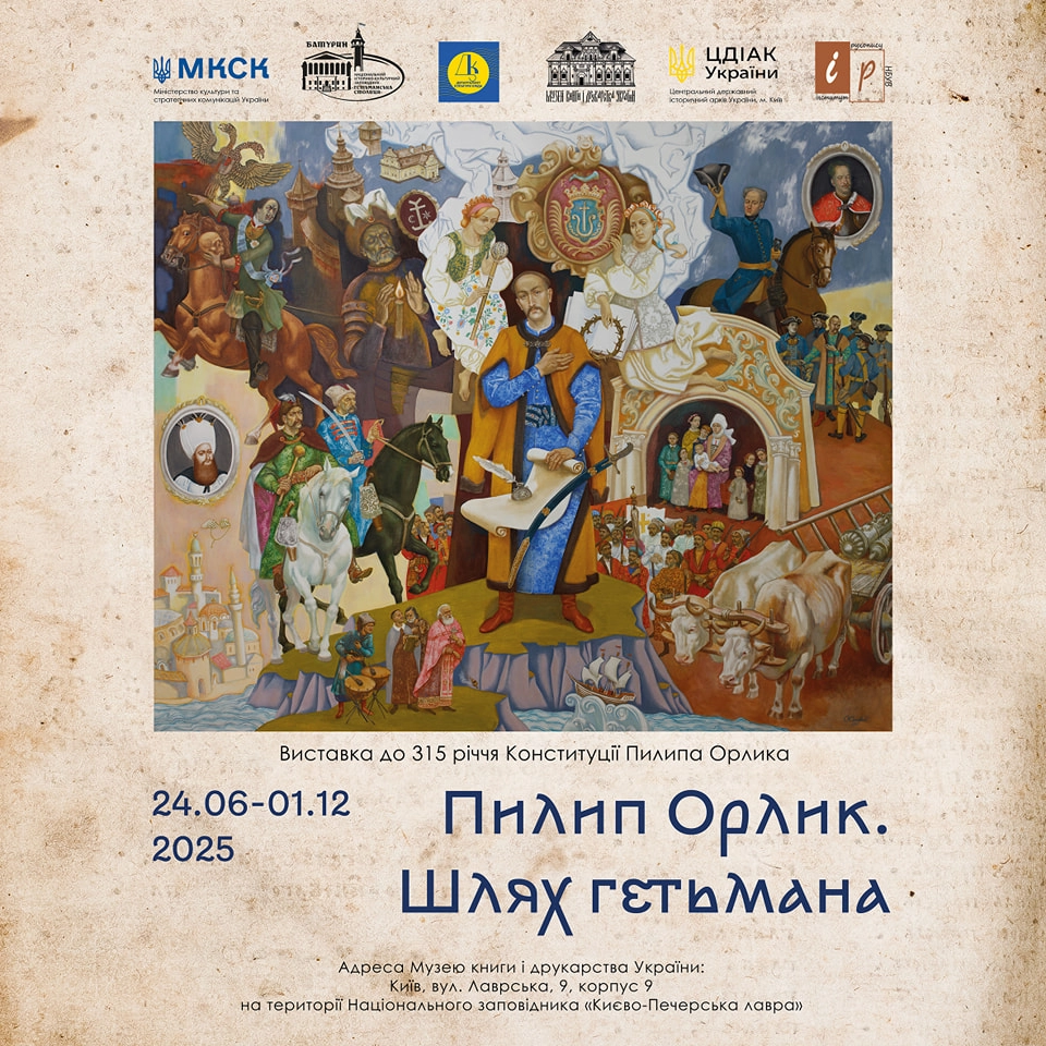 Виставка “Пилип Орлик. Шлях гетьмана” присвячена 315-й річниці Конституції Пилипа Орлика та Дню Конституції України. На ній вперше покажуть унікальні речі, безпосередньо пов’язані з постаттю гетьмана Пилипа Орлика (1672–1742). Загалом буде представлено 33 експонати. Серед них – стародруки, книги, мапи, гравюри, зброя, кахлі з родинними гербами Пилипа Орлика та Івана Мазепи. А також картини з фондових зібрань Національного заповідника “Гетьманська столиця” та Музею книги і друкарства України.