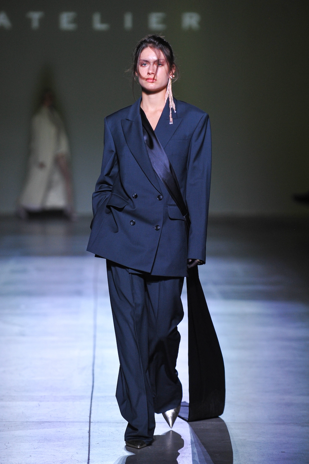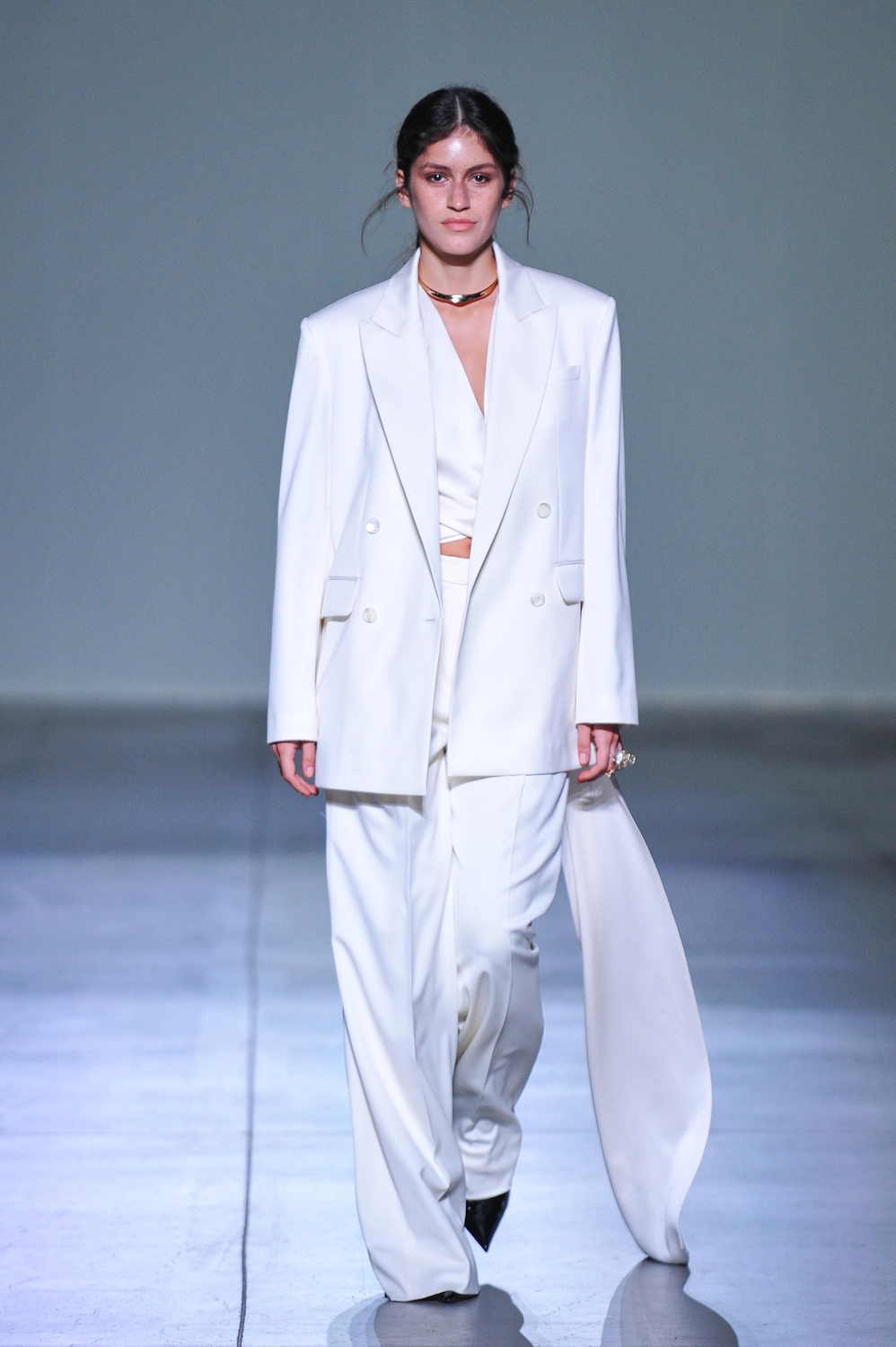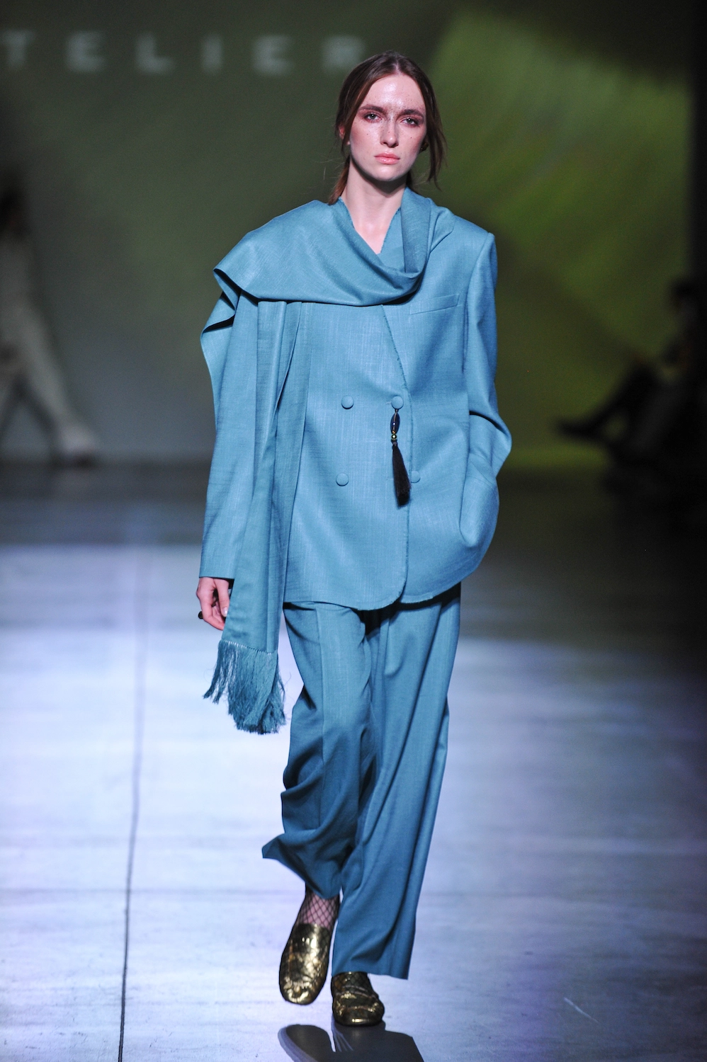 Усі речі – лаконічного крою, у вишуканих кольорах, пошиті з цупкої вовни. Знаковою річчю став жакет з довгим поясом-палантином, що ефектно драпірується як орденська стрічка й спадає шлейфом.