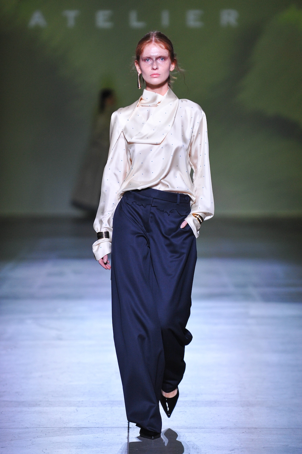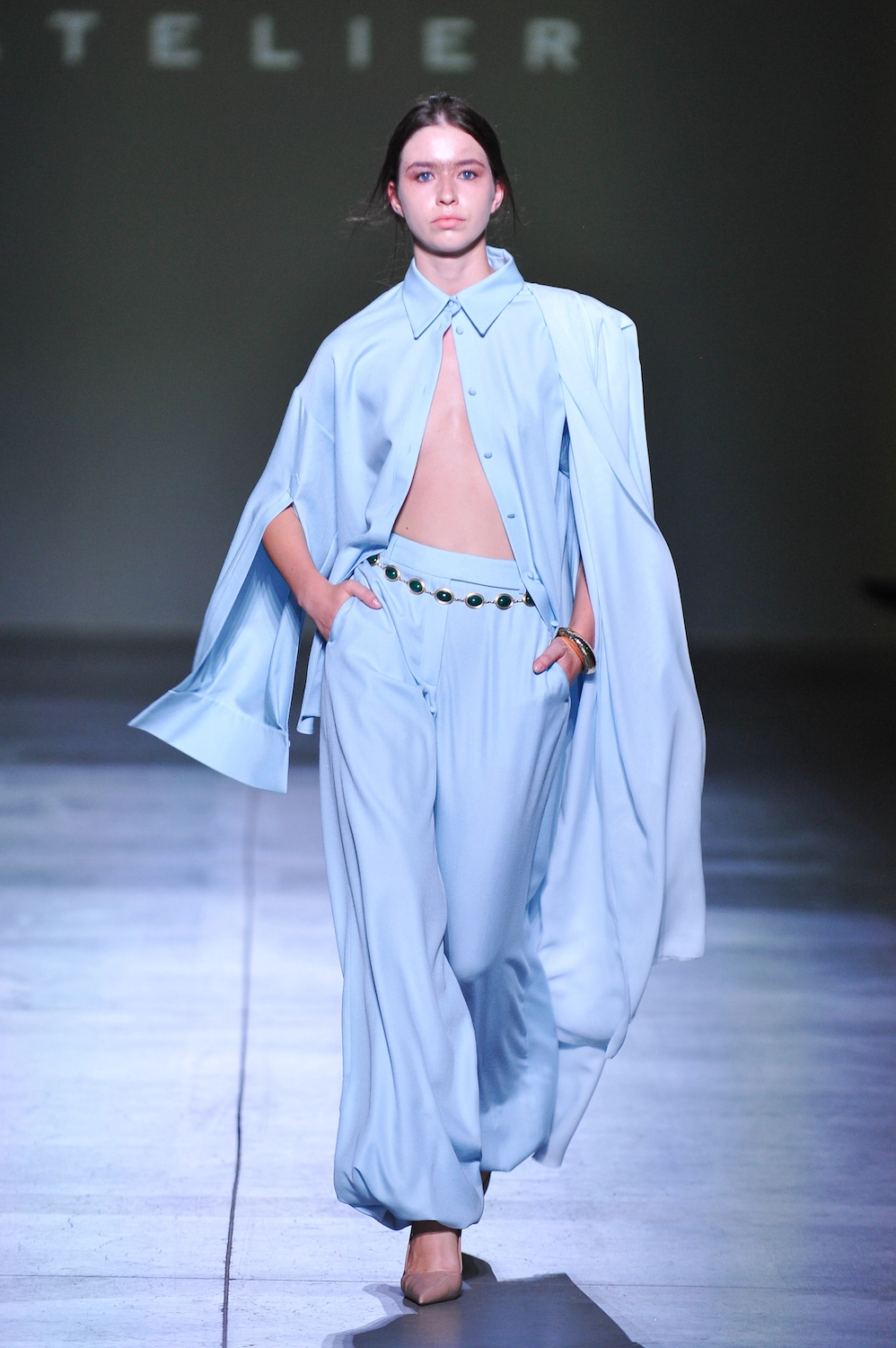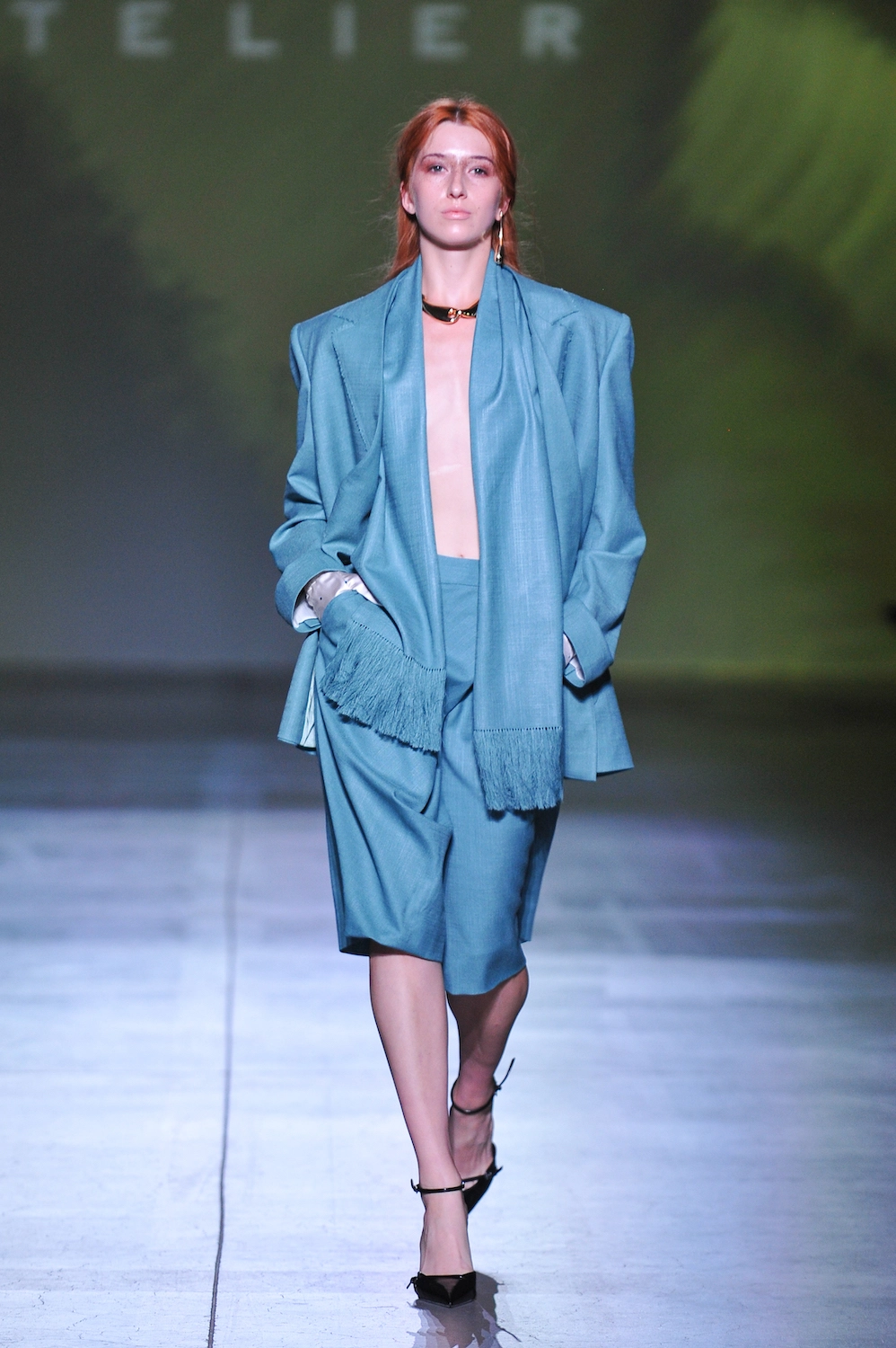 Усі речі – лаконічного крою, у вишуканих кольорах, пошиті з цупкої вовни. Знаковою річчю став жакет з довгим поясом-палантином, що ефектно драпірується як орденська стрічка й спадає шлейфом.