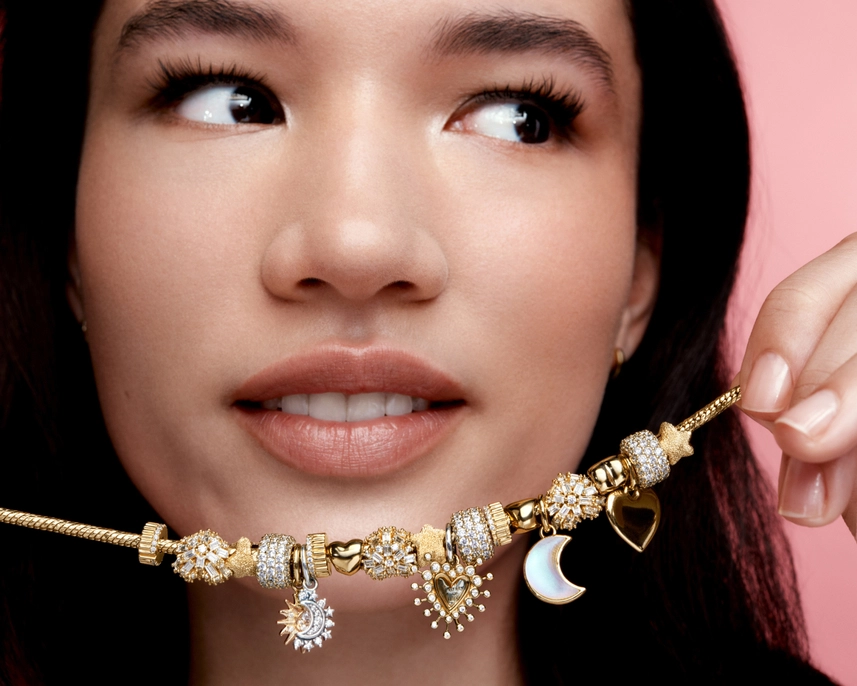 Досліджуючи тему святкових мрій, Pandora презентує нові намистини з місячними мотивами, натхненні сяйвом нічного неба. Особливу увагу привертають прикраси, виготовлені зі скляних елементів із перламутровим ефектом та смоли з опаловим ефектом. Ці прикраси в буквальному сенсі випромінюють сяйво, зберігаючи тепло щасливих спогадів.