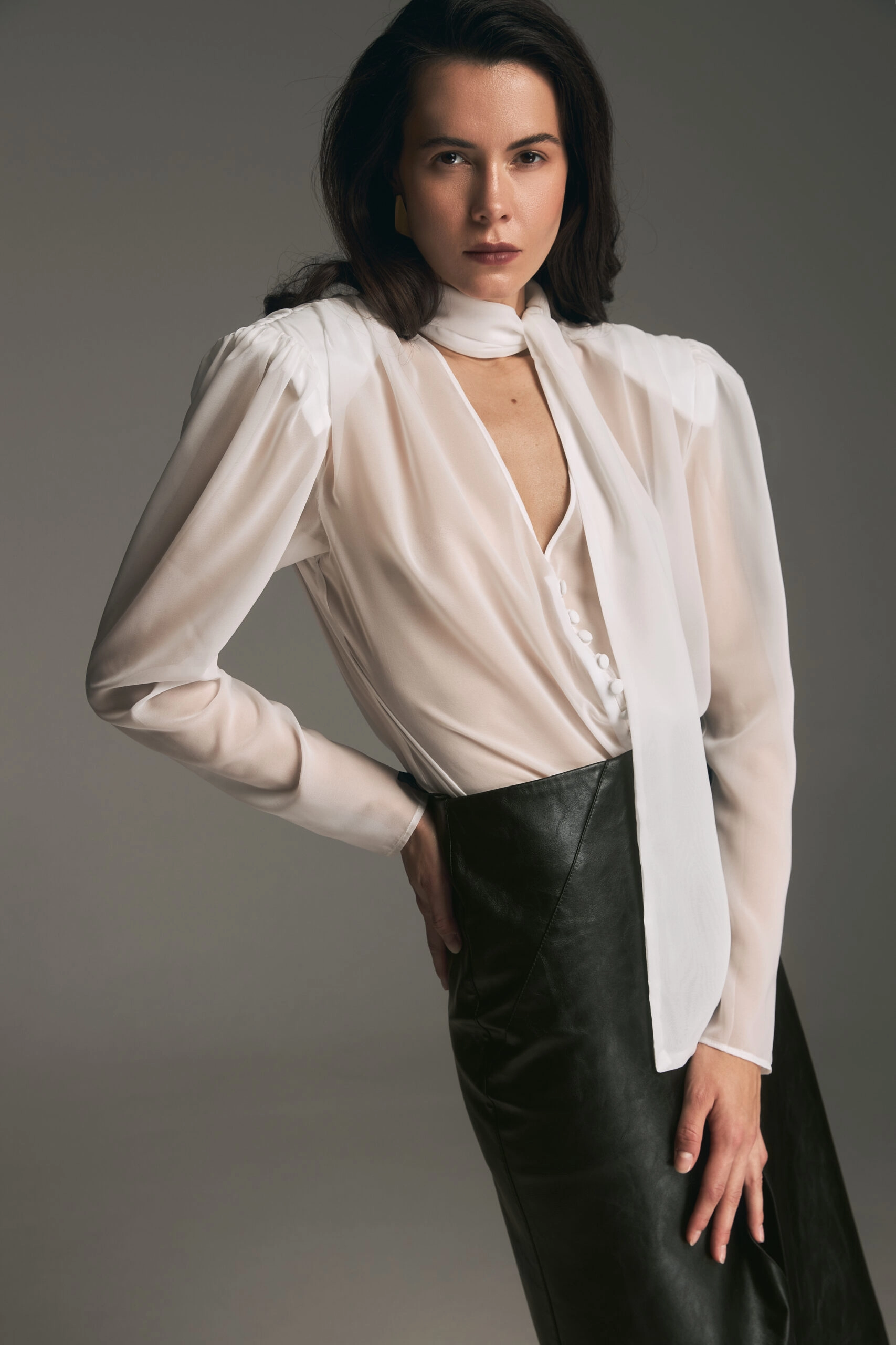 Колекція тримається на тонкій роботі з фактурами: сатин у блузах і сукнях додає м’якого сяйва та пластичності; гіпюр у лонгсливах окреслює силует делікатною напівпрозорістю; костюмна тканина з вовною формує чіткі архітектурні лінії жакетів, сарафанів, штанів і шортів; екошкіра в сукнях та міні надає виразного акценту й підсилює характер дропу. Разом ці матеріали створюють цілісну естетику — точну у формах, чуттєву в динаміці, сучасну в подачі.