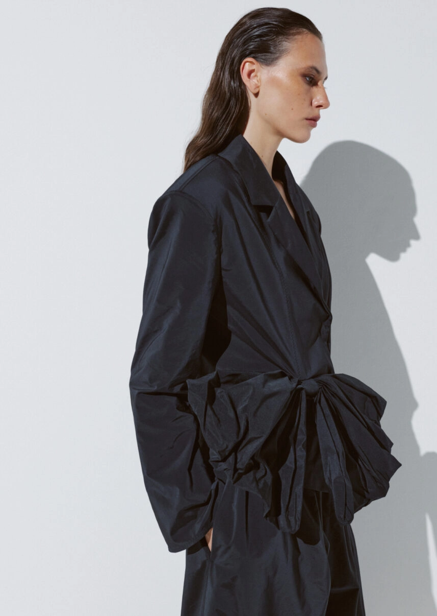 Одним із ключових елементів лінійки стає біла сукня максі з акцентованими плечима. Відсилання до естетики 1980-х також звучать у виборі великих бантів, що завершують образи нового дропу СЇХ.