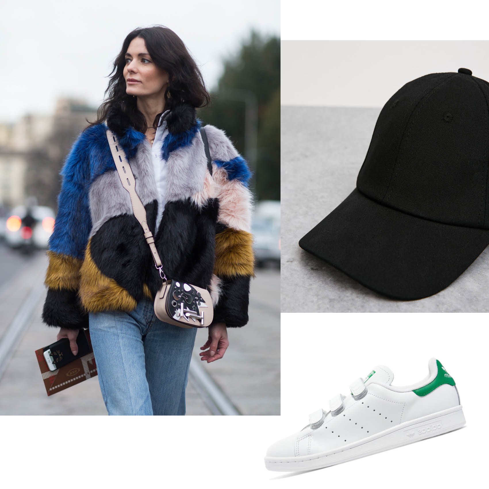 Шкіряні кеди добре доповнять образ, у якому є елемент хутряного одягу. Кеди необхідно доповнити аксесуаром у спортивному стилі, наприклад бейсболкою.