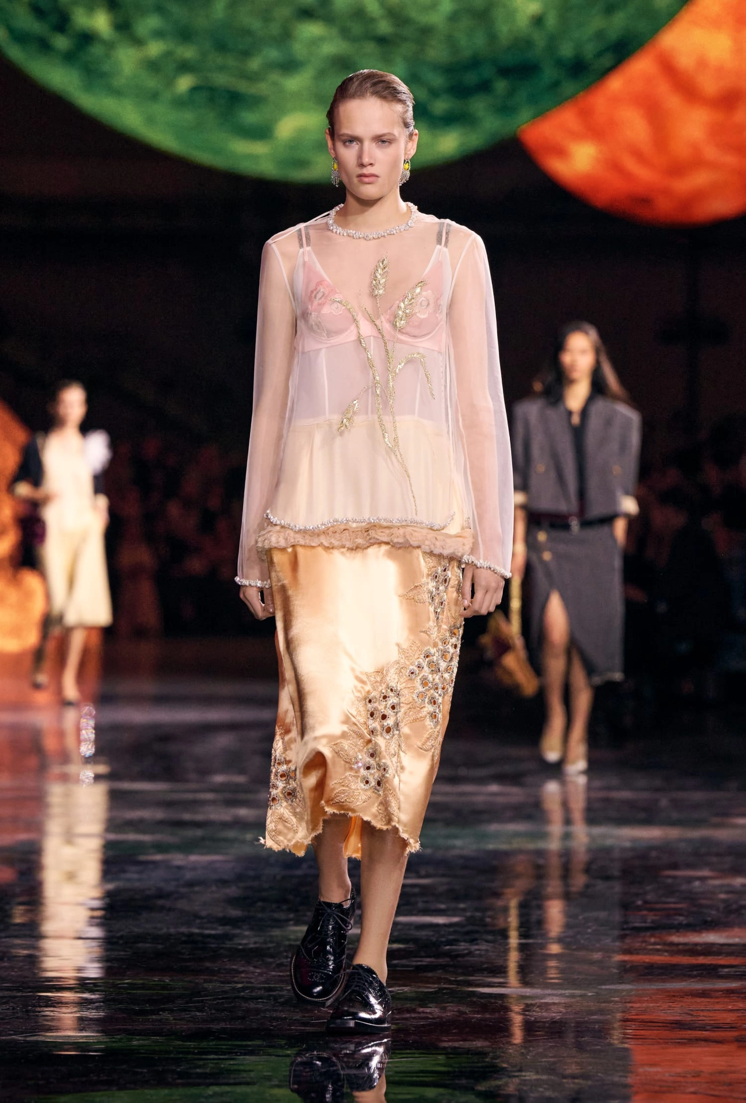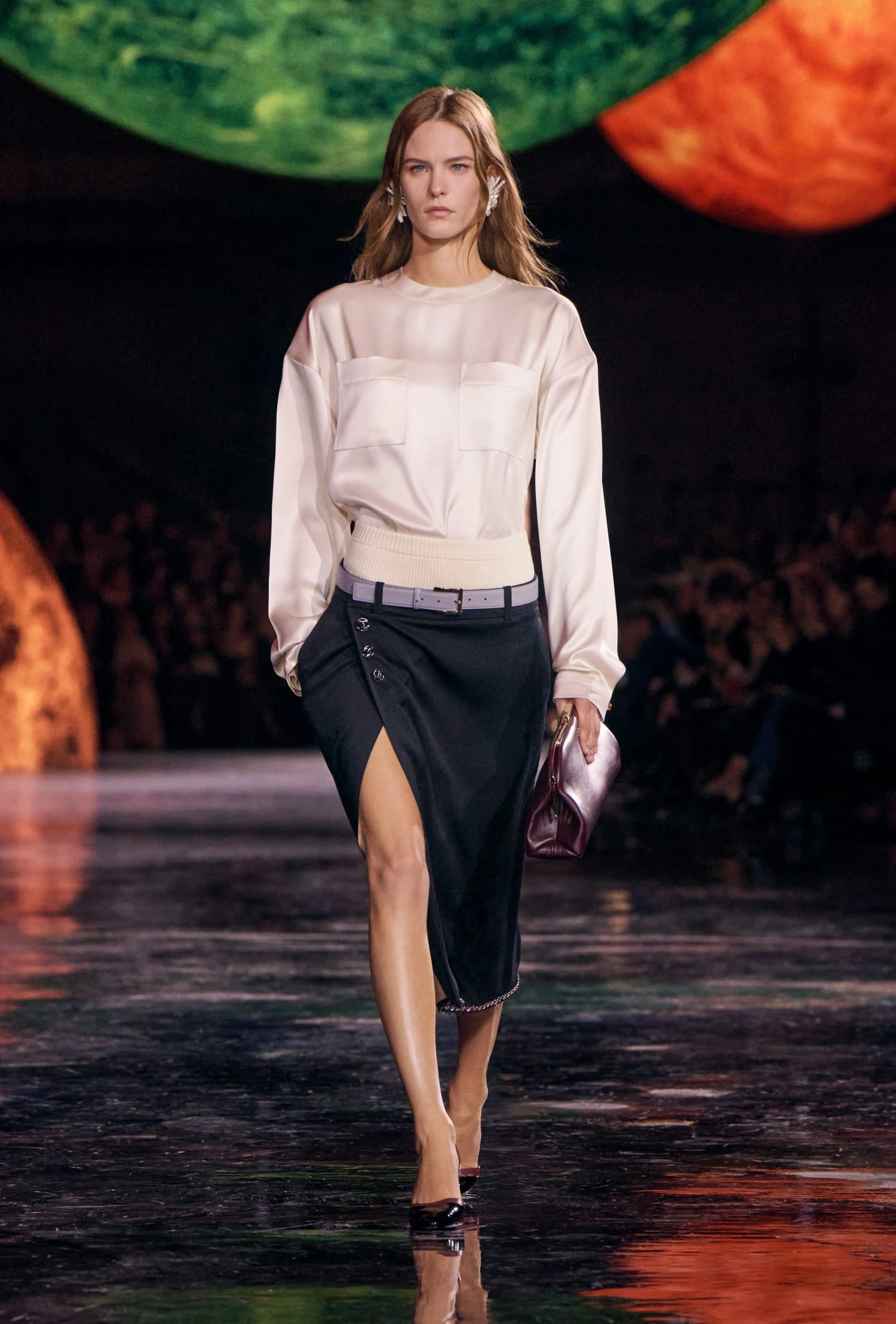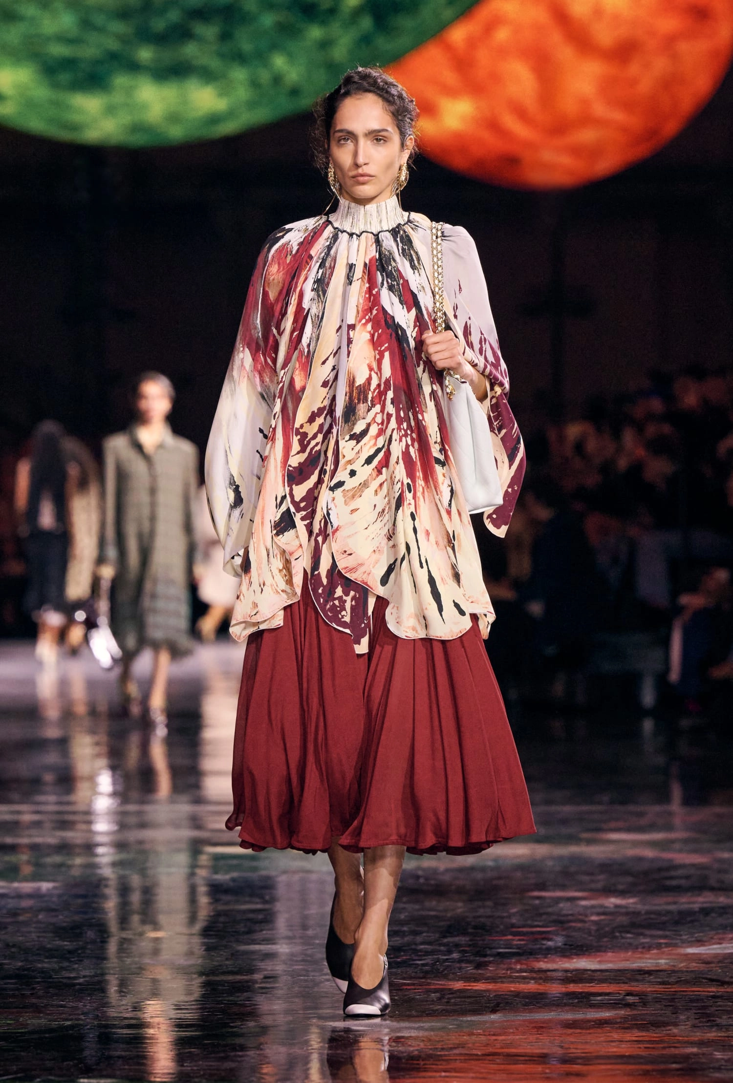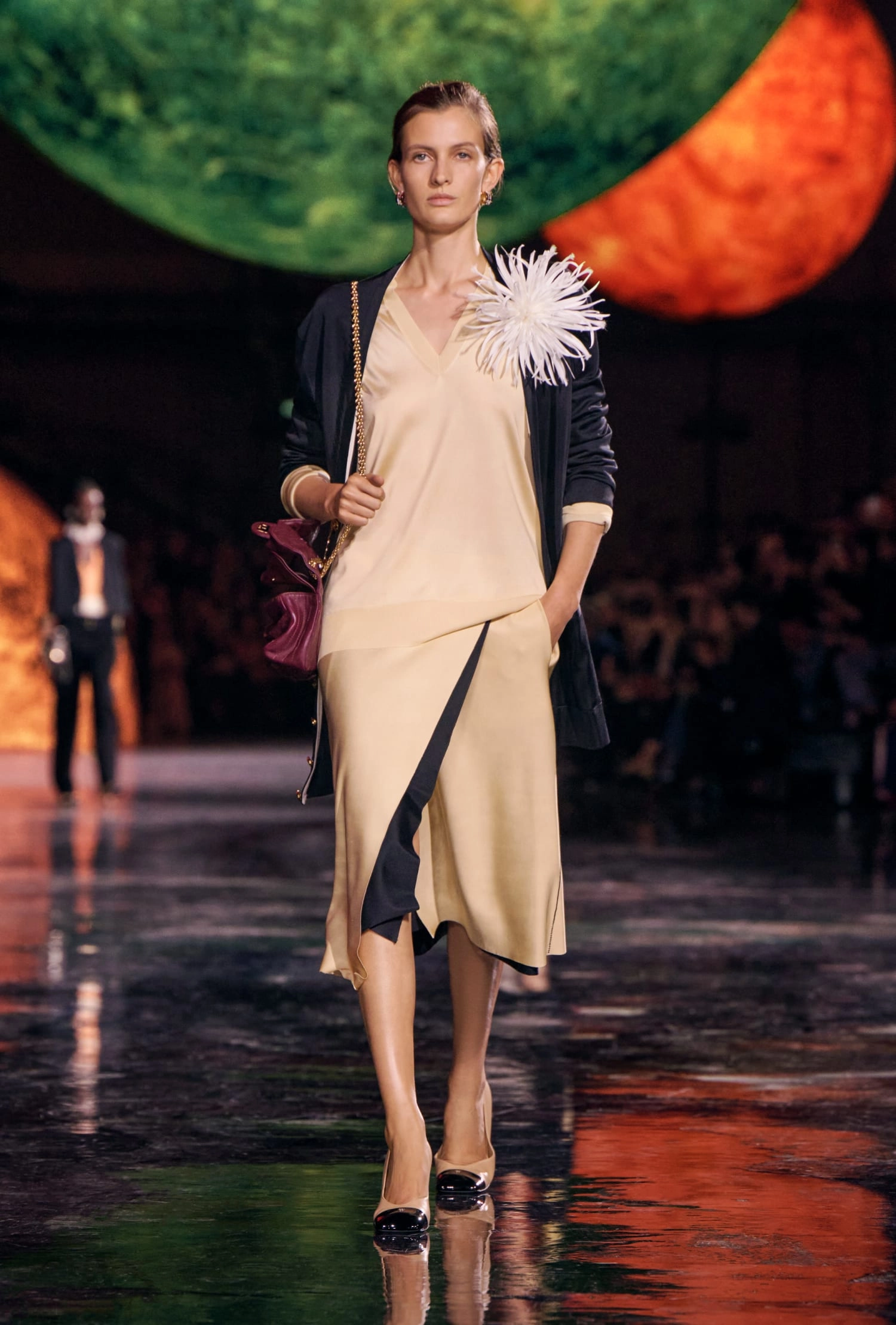 Блазі також зробив акцент на класичних речах Chanel. Усі вони – немов ношені: це означає, що ці речі люблять, їх носять і передадуть далі у спадщину наступним поколінням. Так у колекції представлені злегка “зім’яті” сумки 2.55. А зім’яті камелії прикрашають шовкові костюми.
