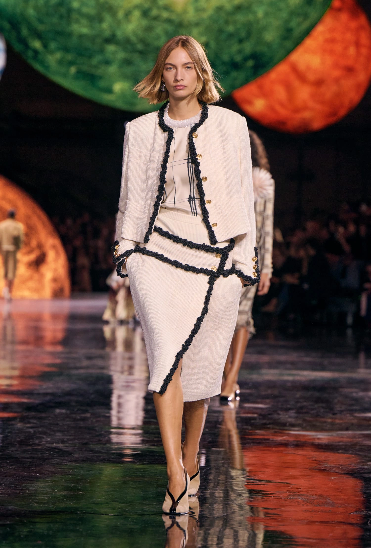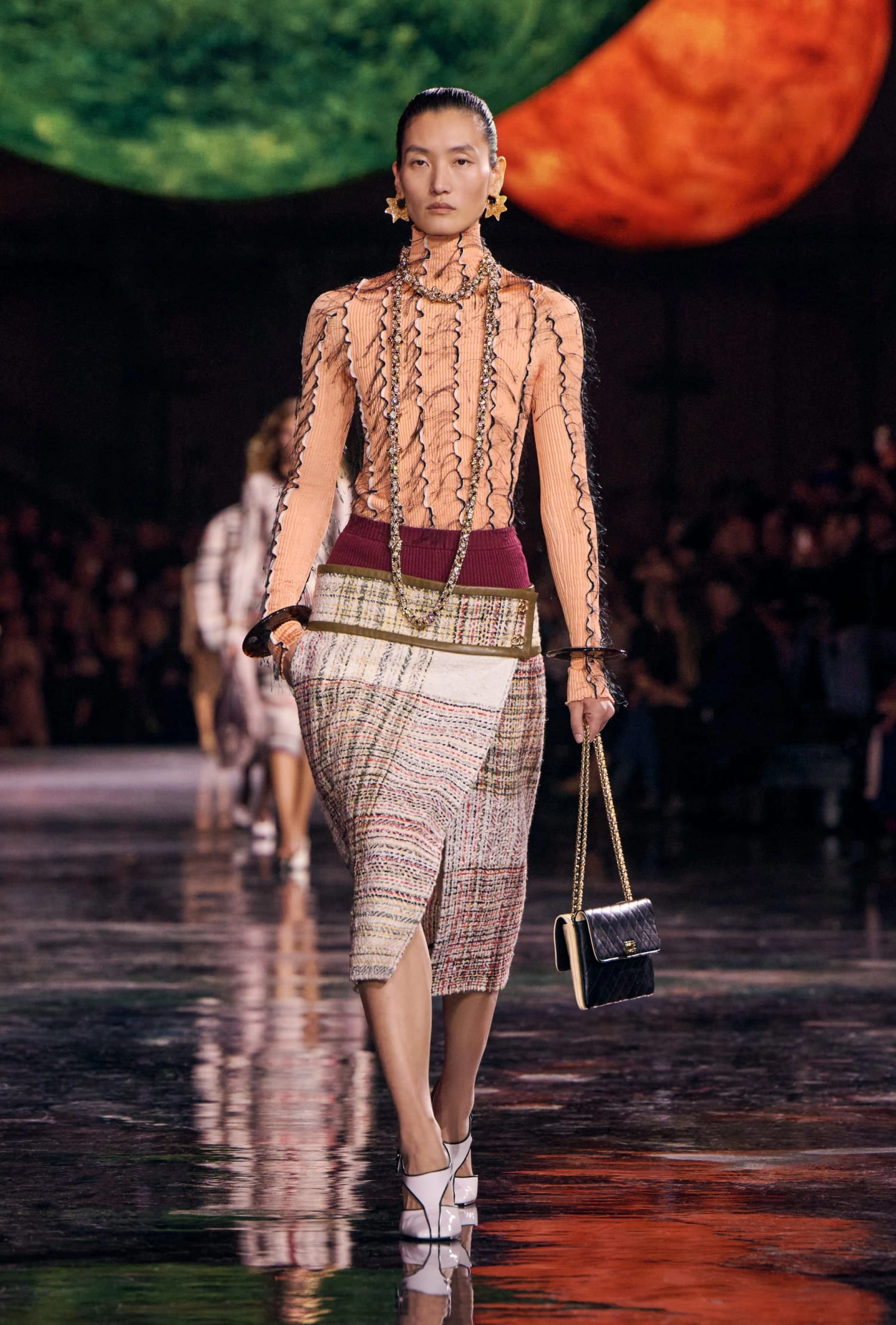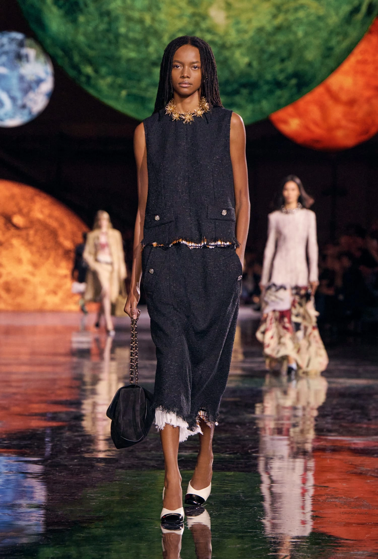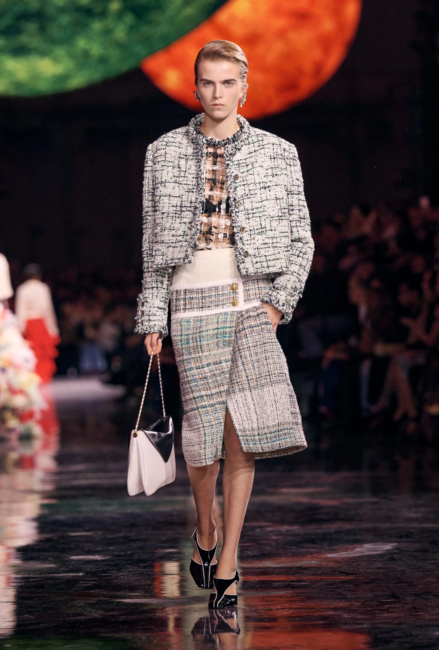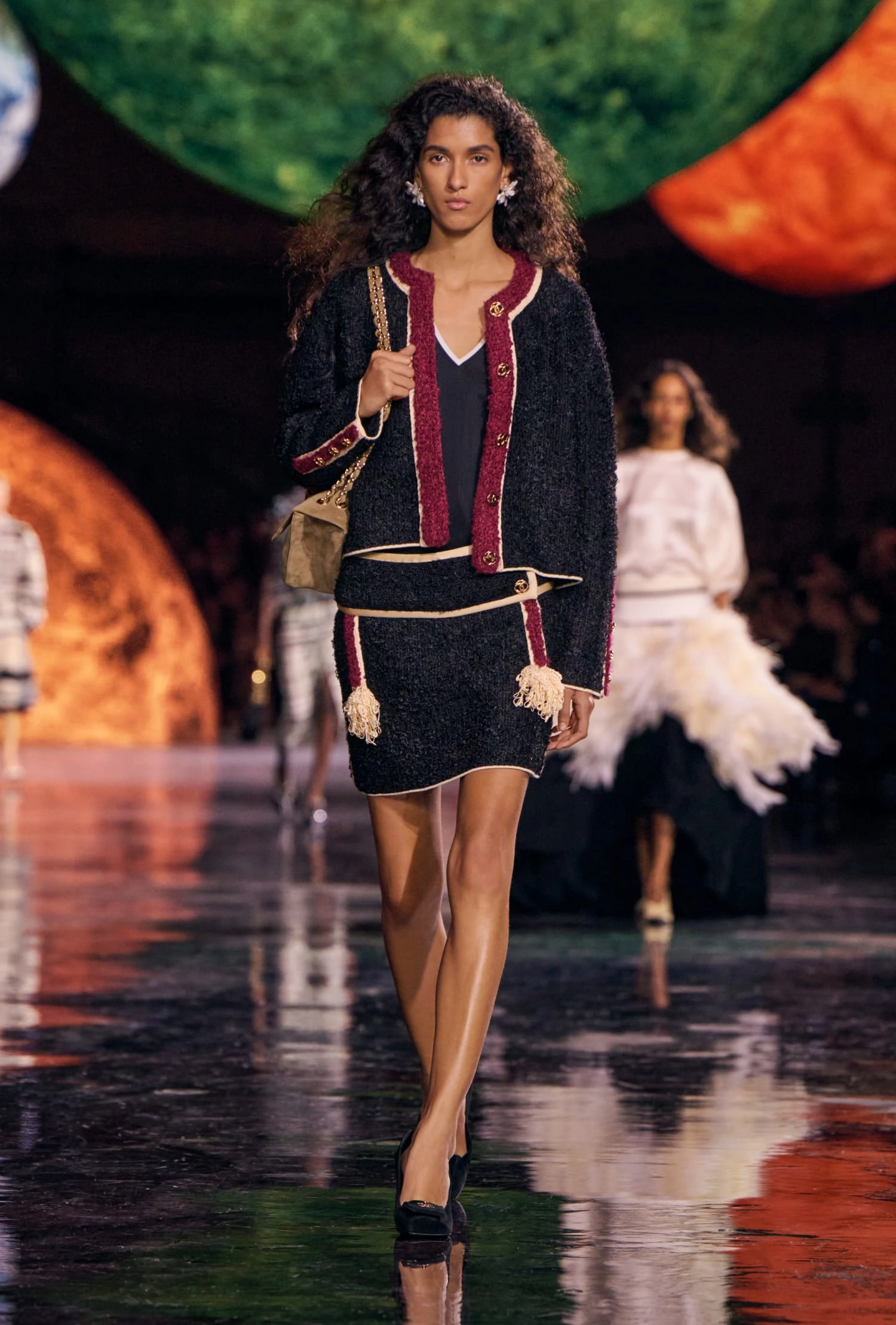 Графічні чорно-білі лінії відсилають до ар-деко та фірмового пакування Chanel – вони втілені у трикотажах. У колекції безліч твідів і плетив: твідові сітки стають ручними вузликовими плетеннями, переосмислюючи традиційний костюм Chanel.