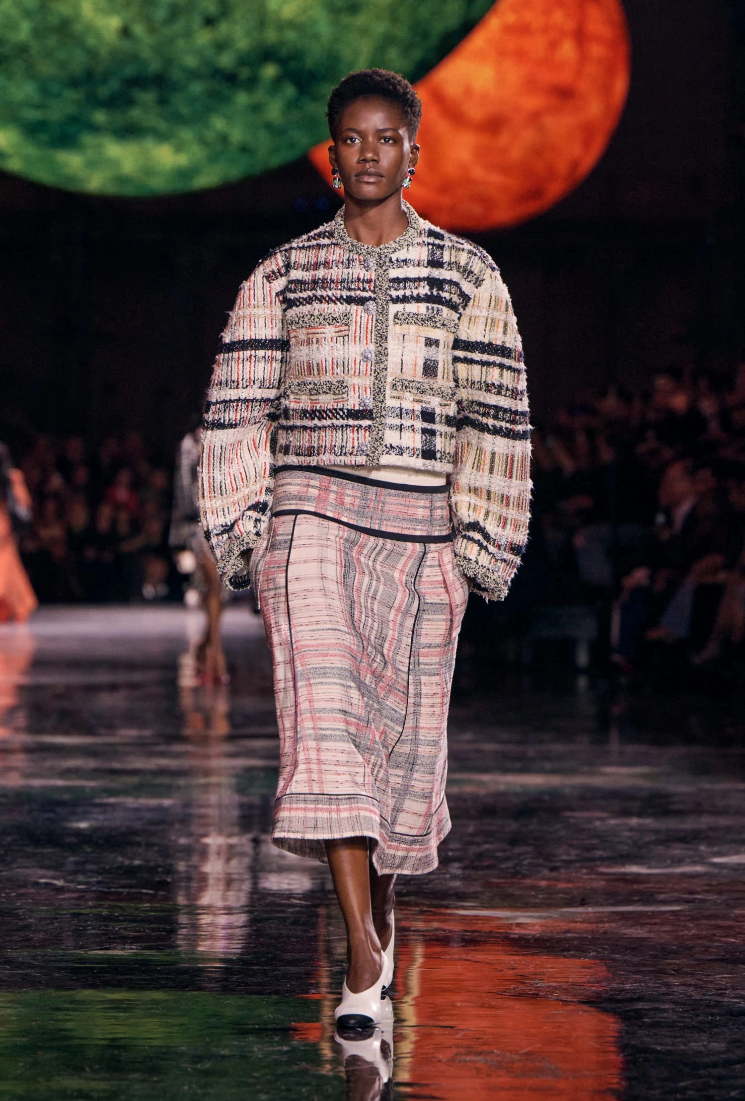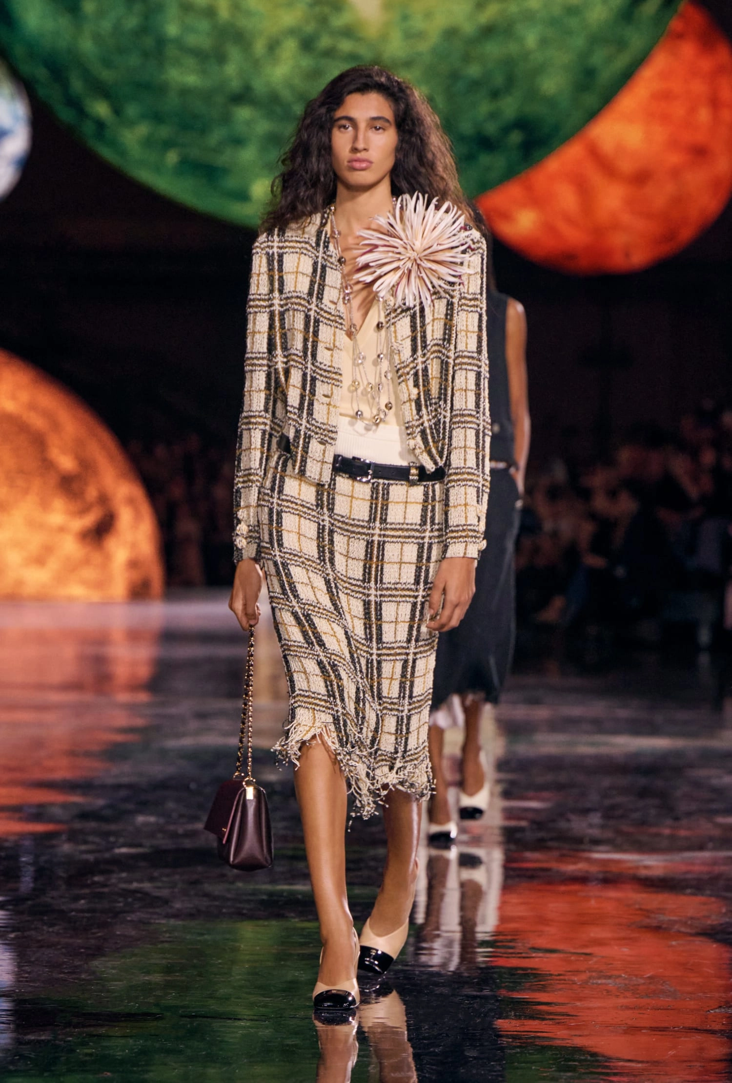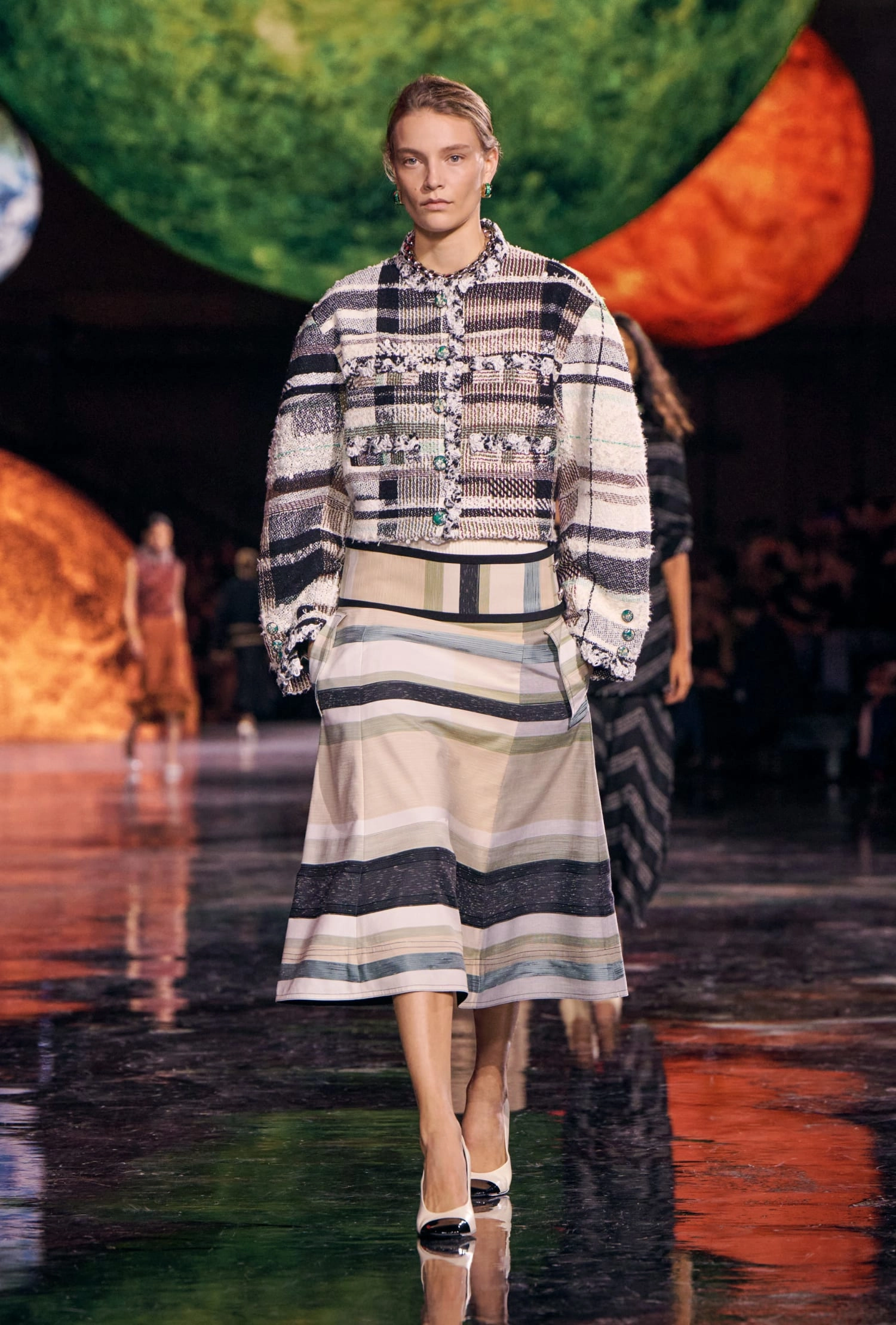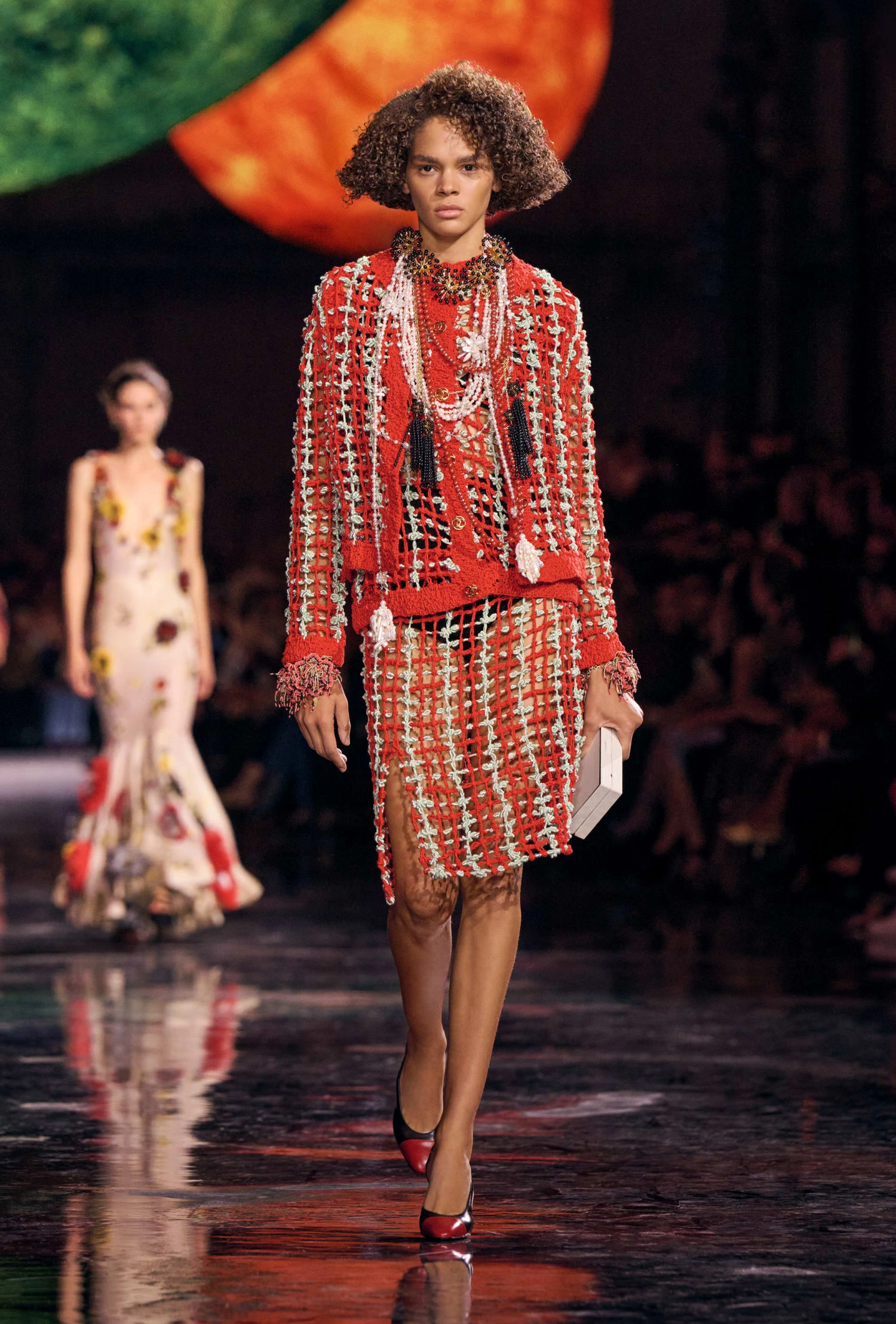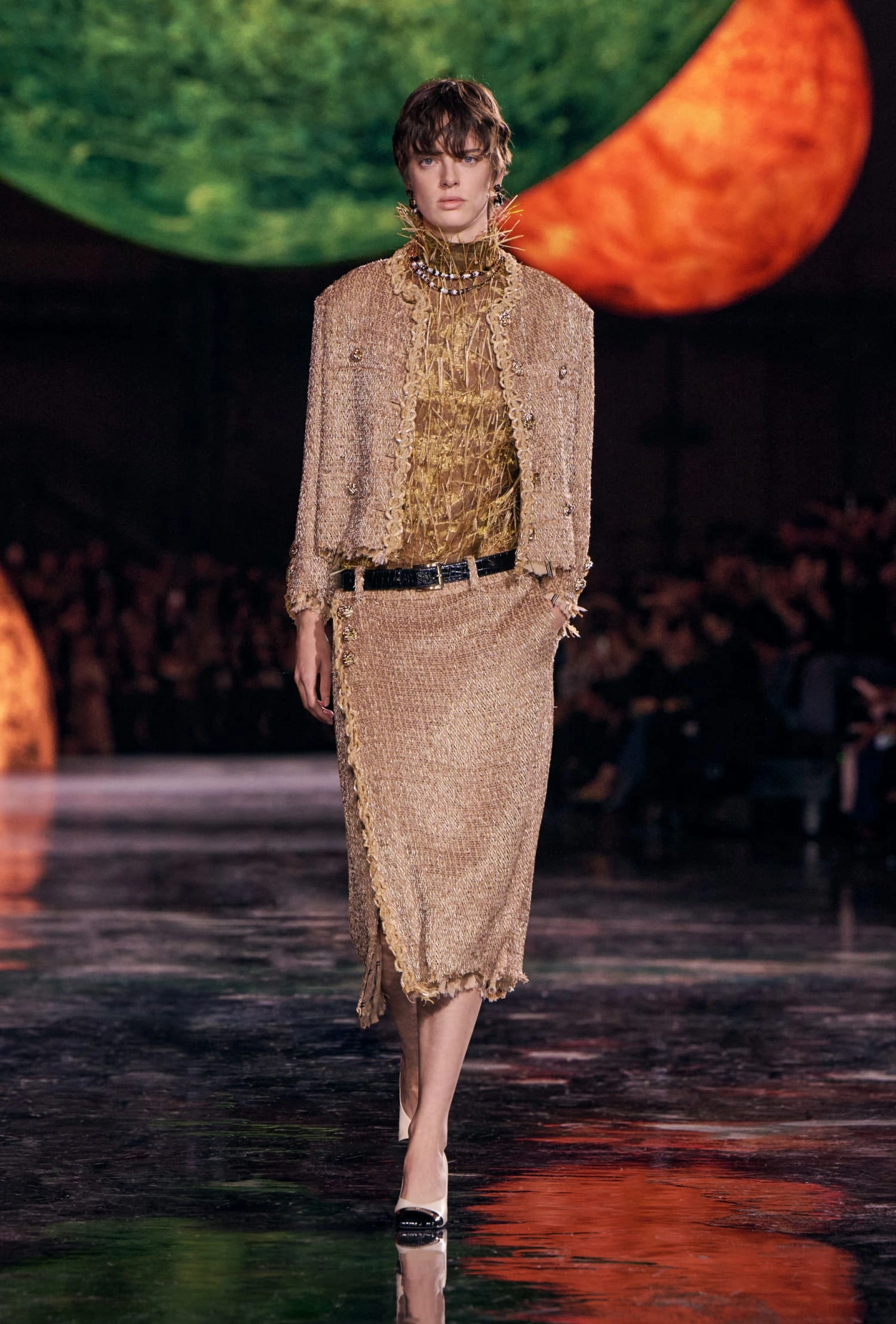 Графічні чорно-білі лінії відсилають до ар-деко та фірмового пакування Chanel – вони втілені у трикотажах. У колекції безліч твідів і плетив: твідові сітки стають ручними вузликовими плетеннями, переосмислюючи традиційний костюм Chanel.