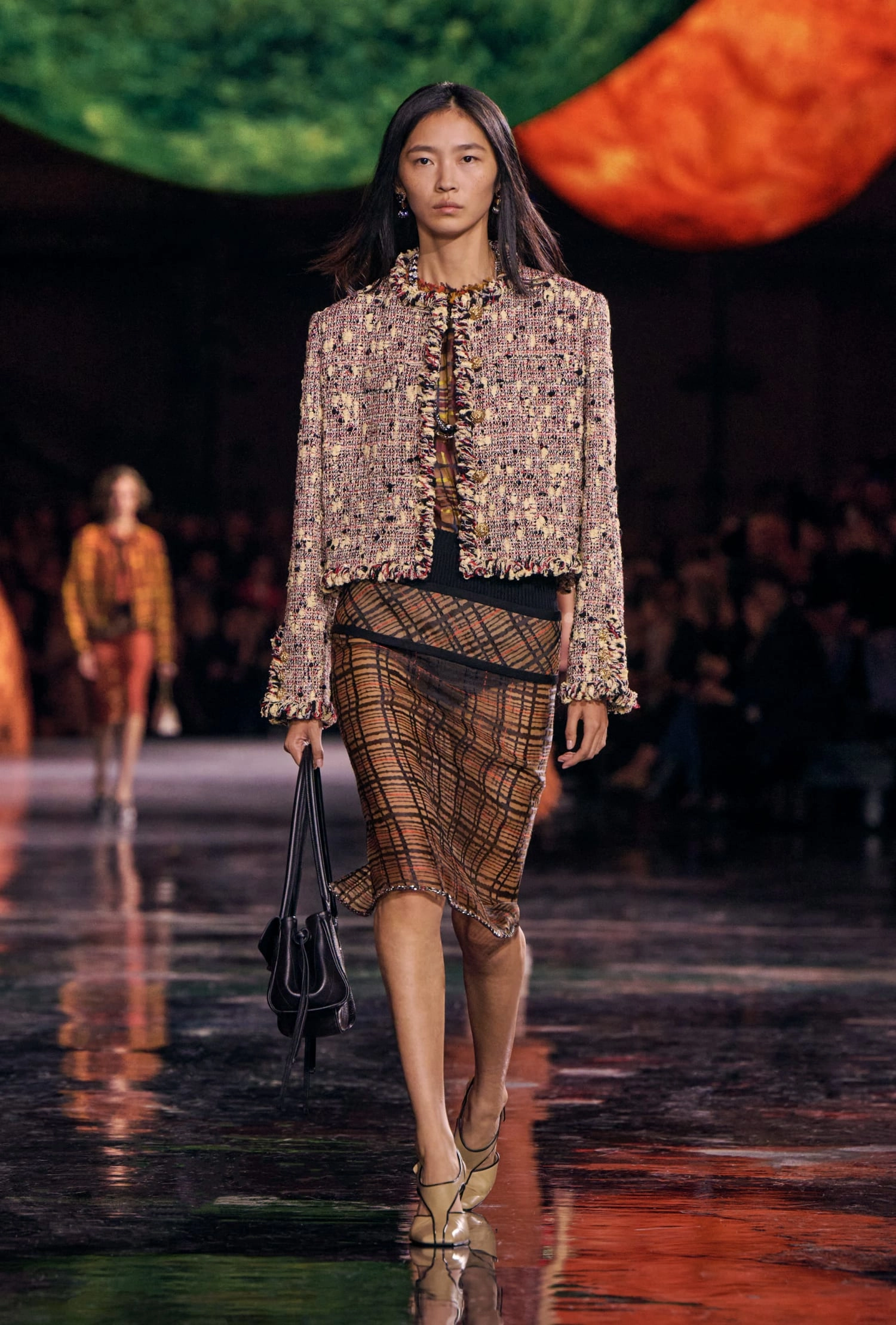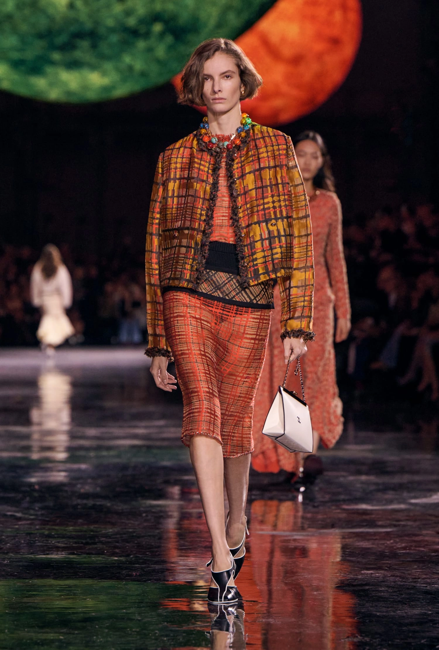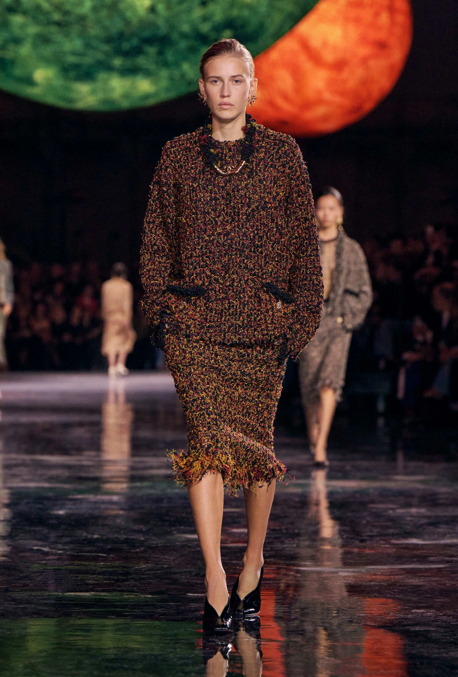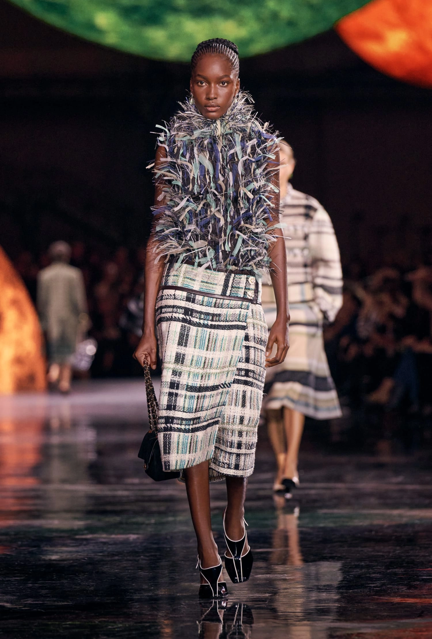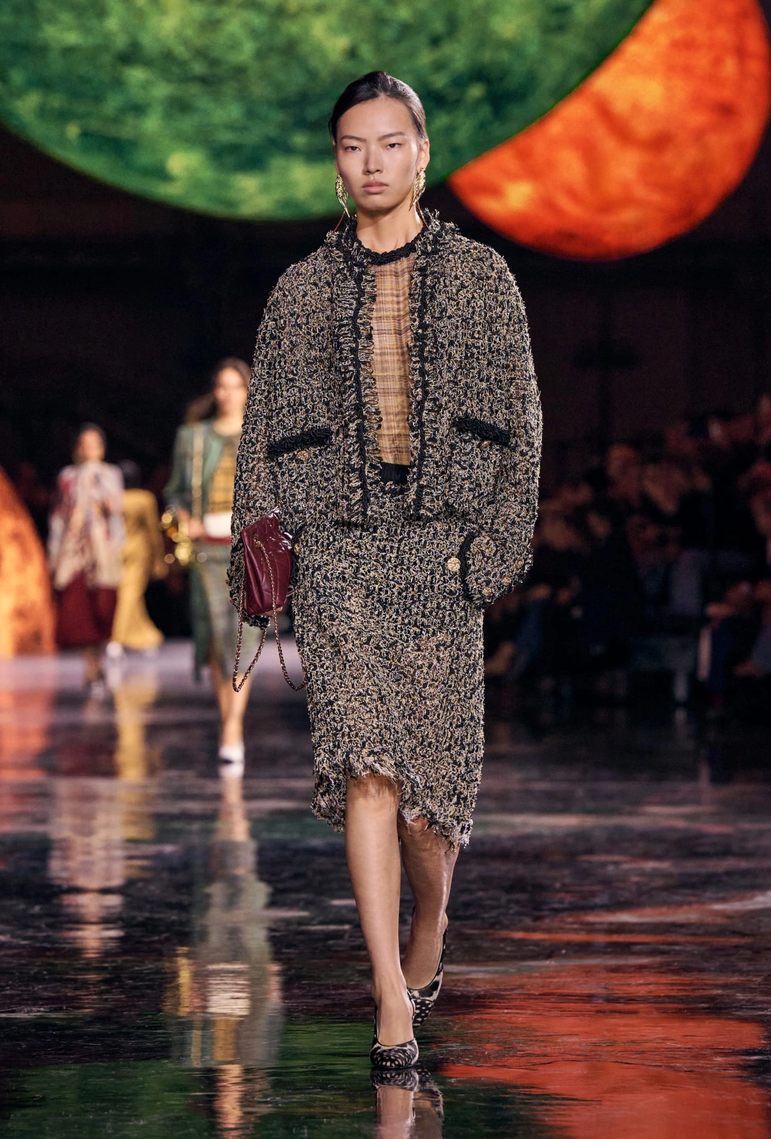 Графічні чорно-білі лінії відсилають до ар-деко та фірмового пакування Chanel – вони втілені у трикотажах. У колекції безліч твідів і плетив: твідові сітки стають ручними вузликовими плетеннями, переосмислюючи традиційний костюм Chanel.
