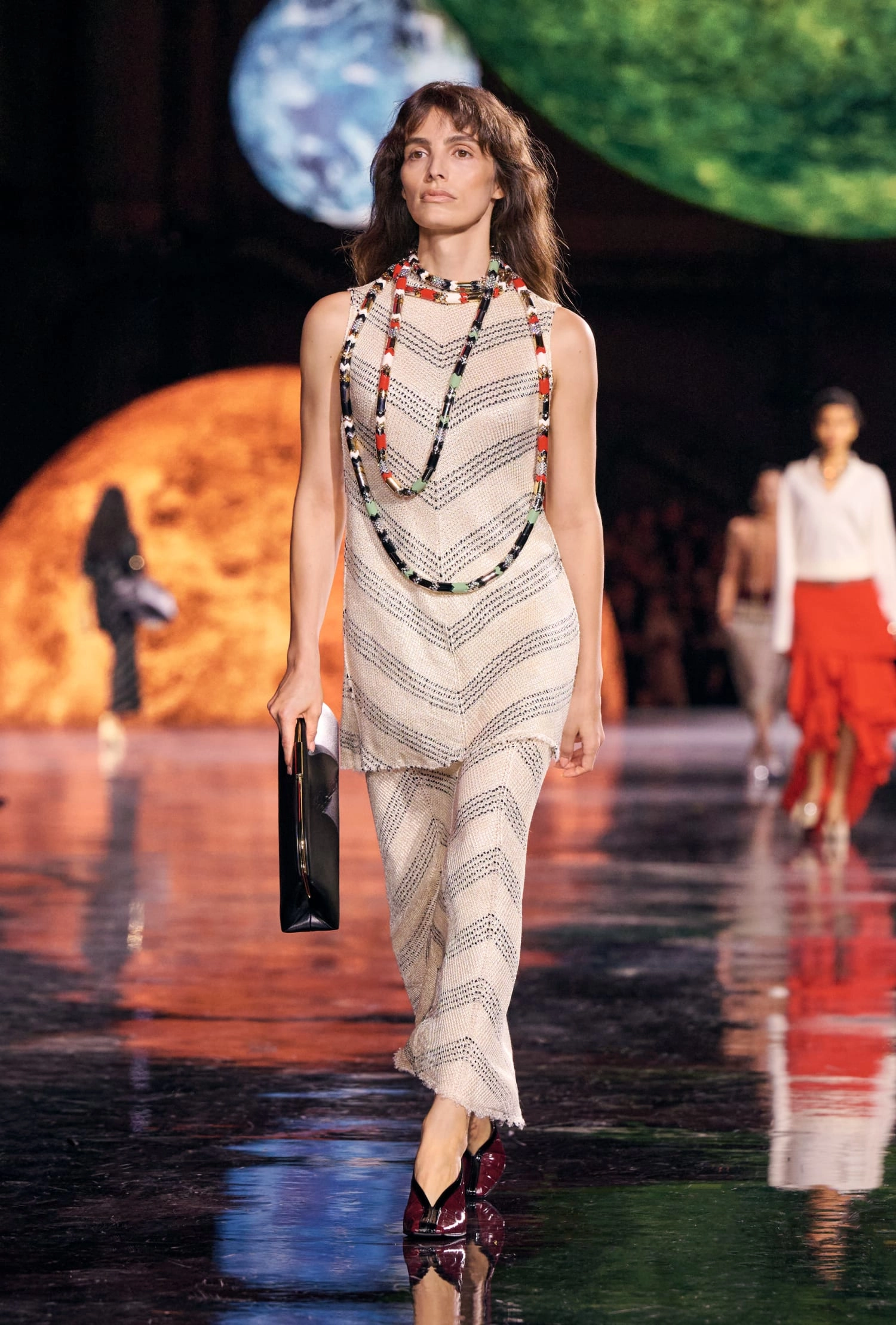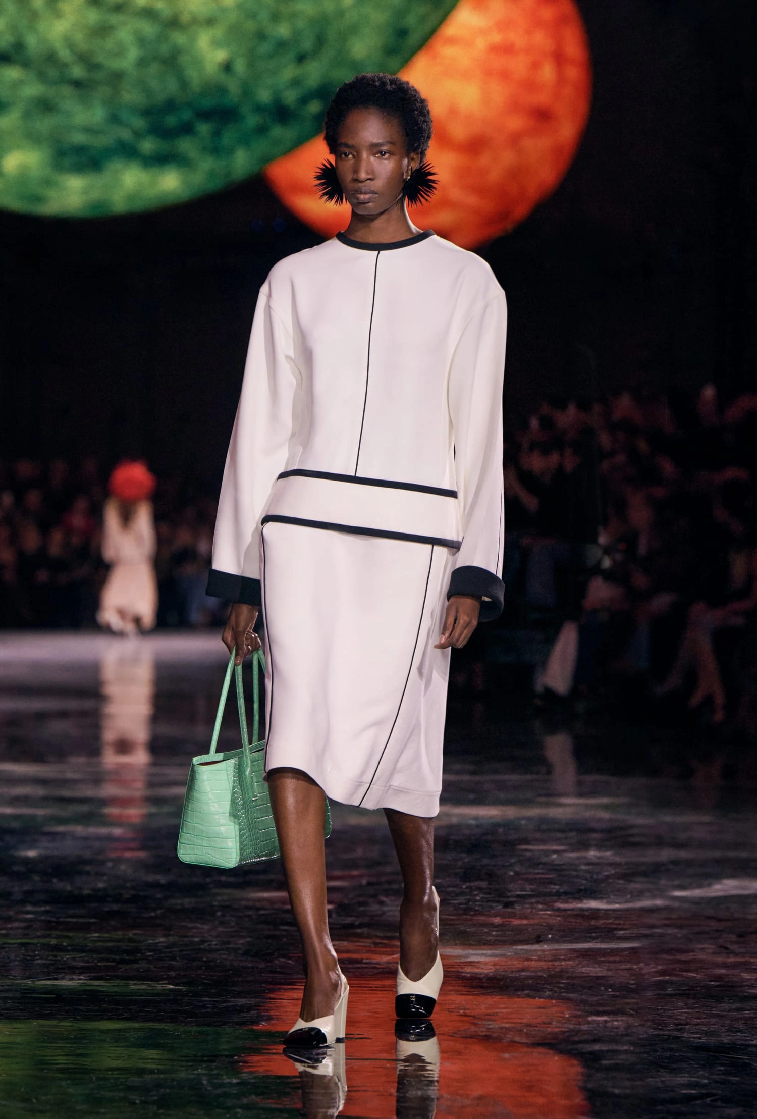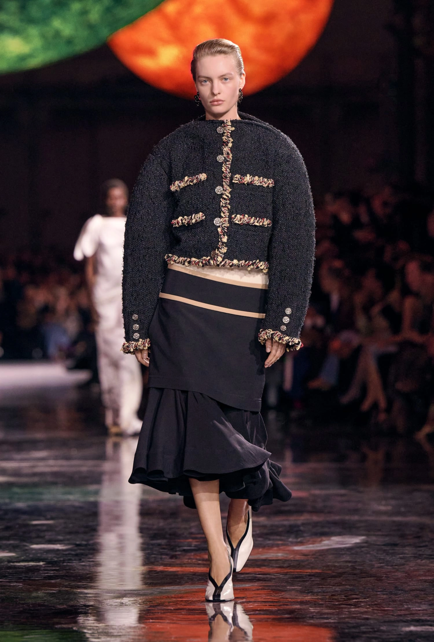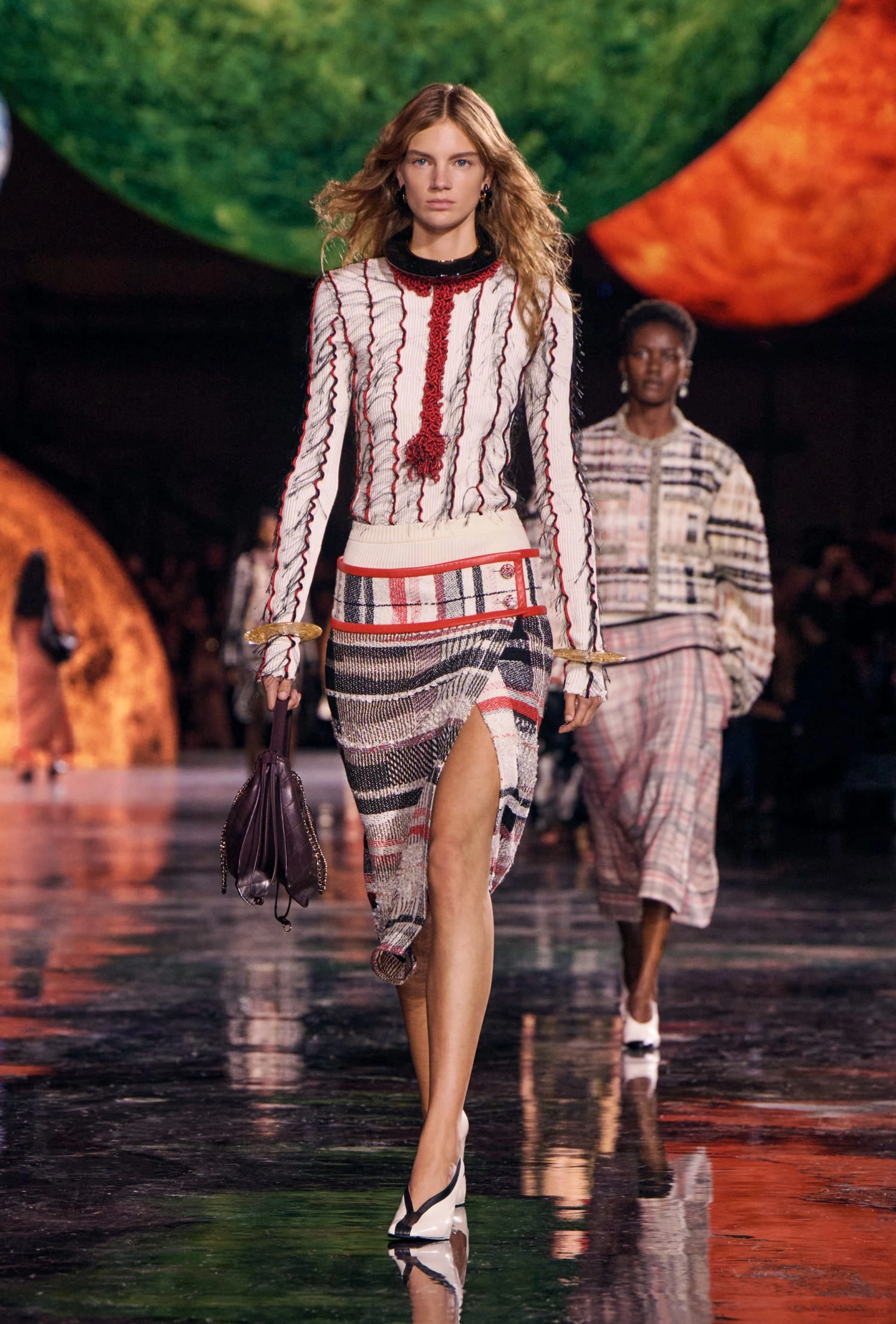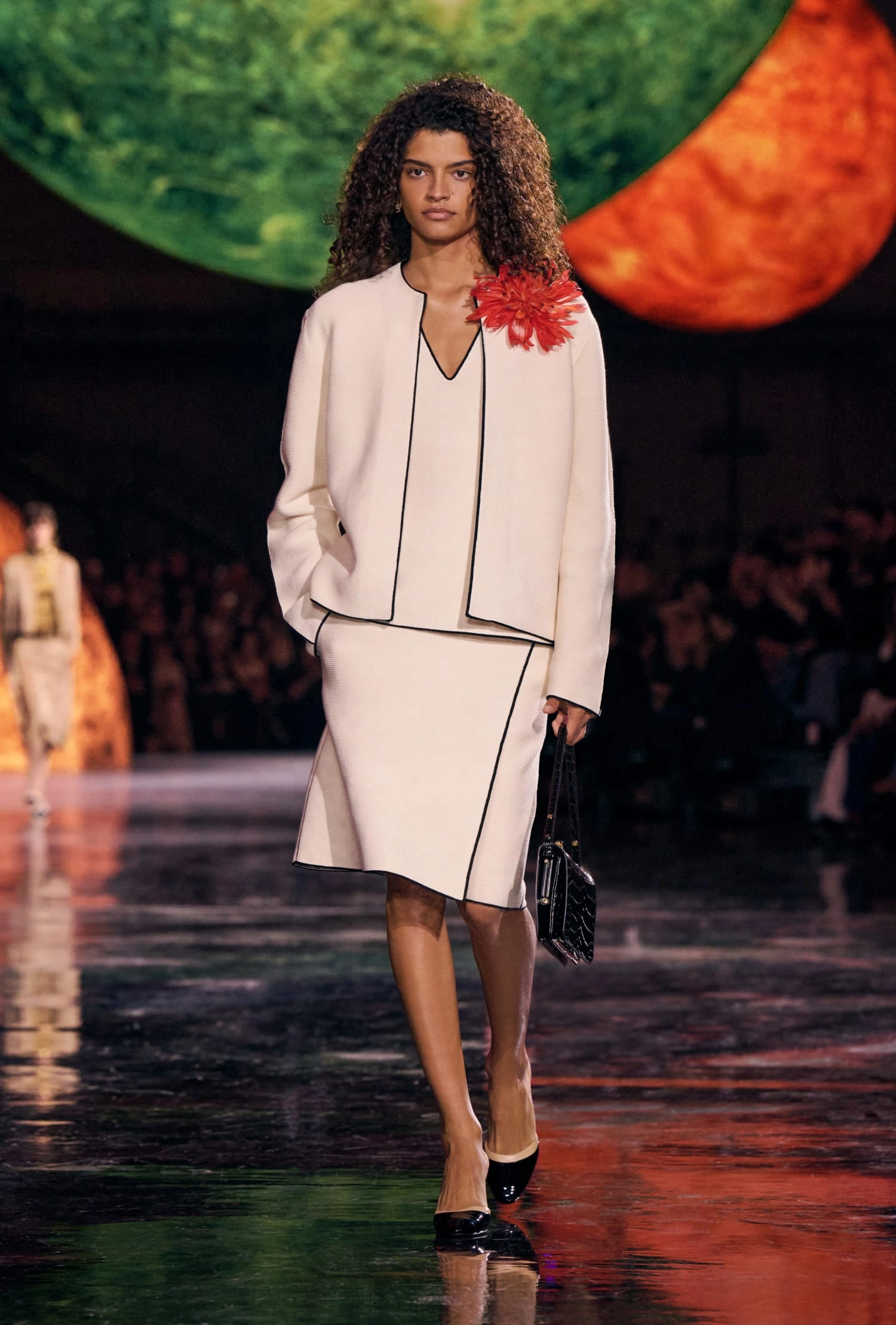 Графічні чорно-білі лінії відсилають до ар-деко та фірмового пакування Chanel – вони втілені у трикотажах. У колекції безліч твідів і плетив: твідові сітки стають ручними вузликовими плетеннями, переосмислюючи традиційний костюм Chanel.