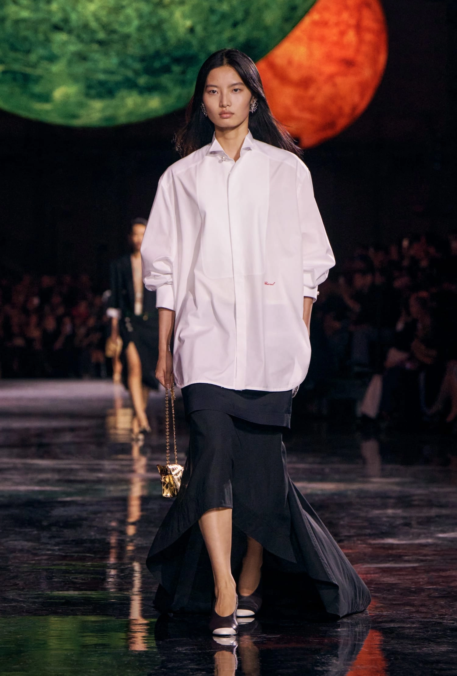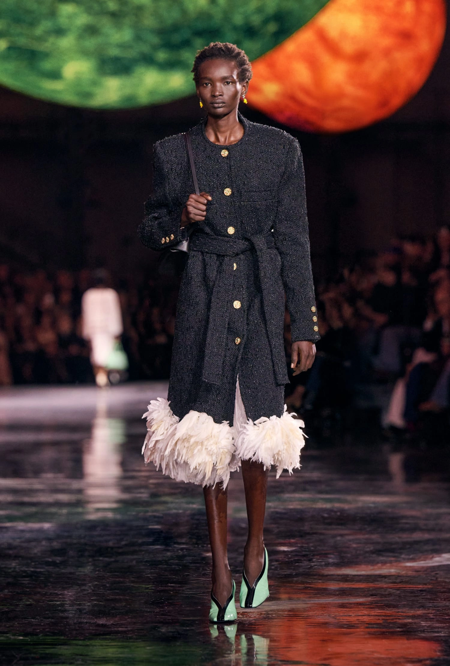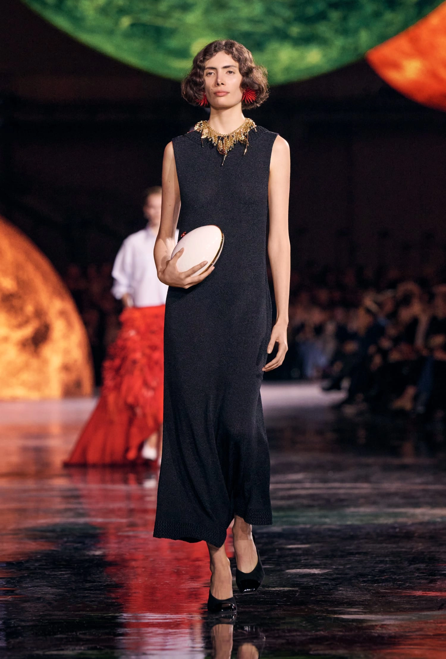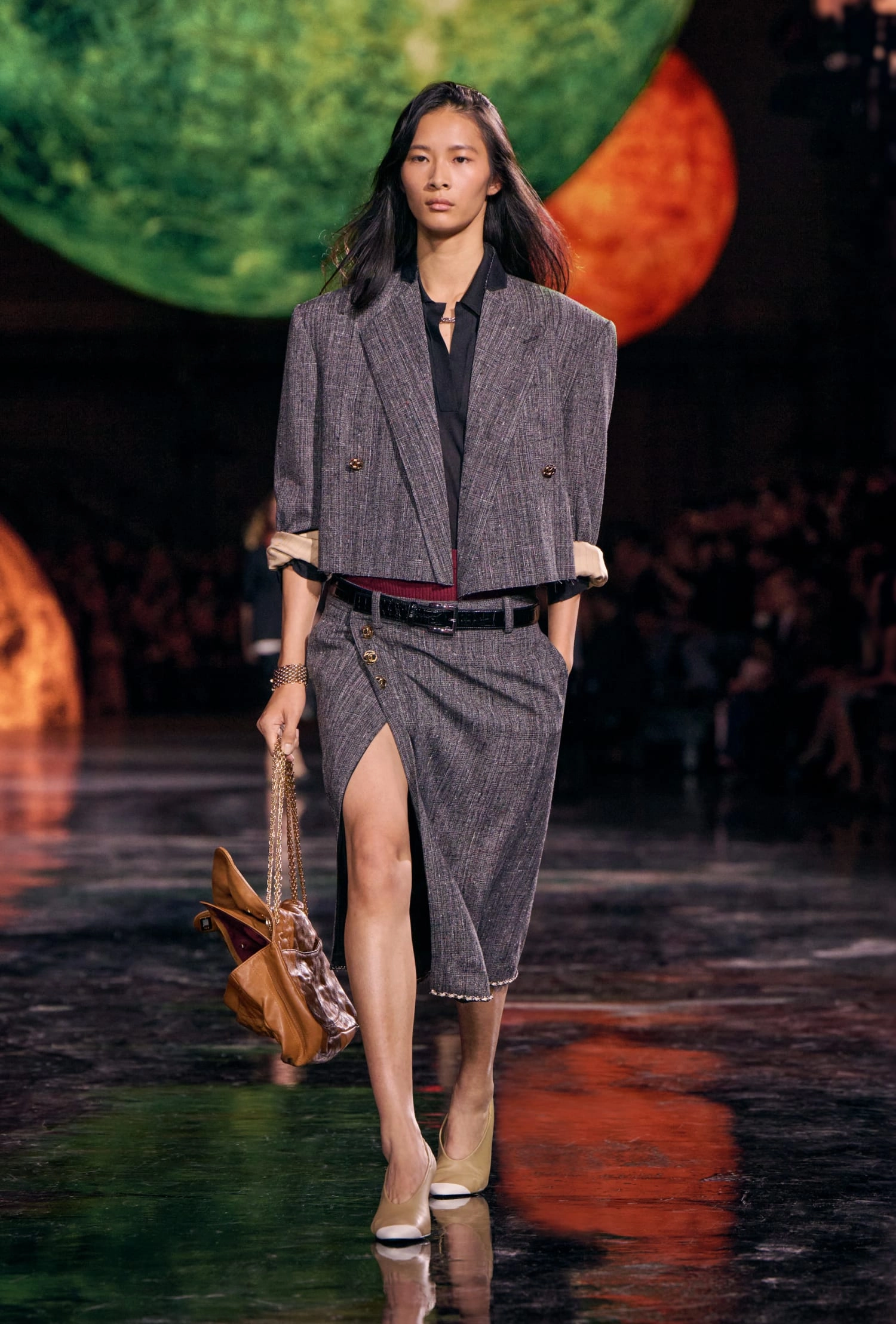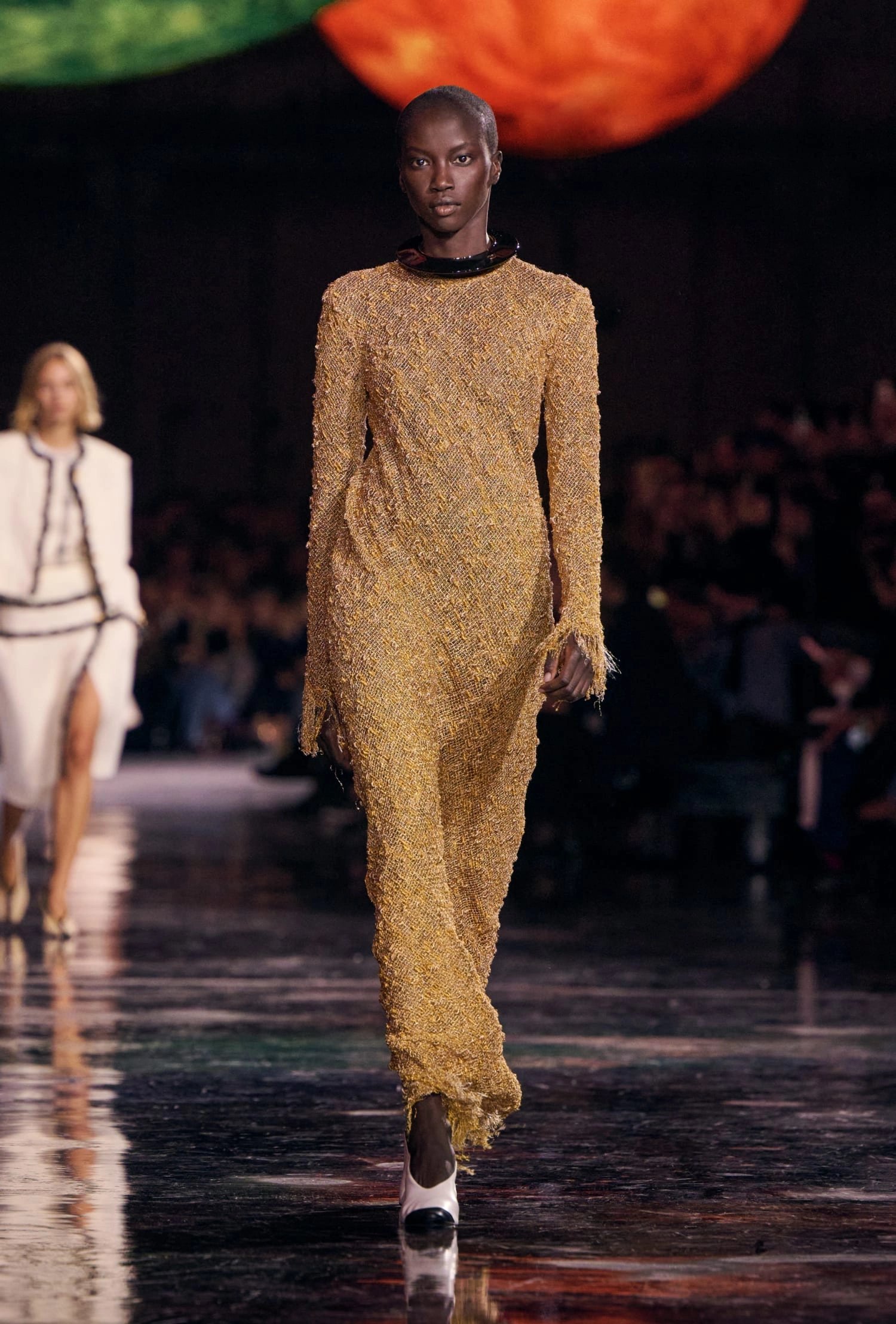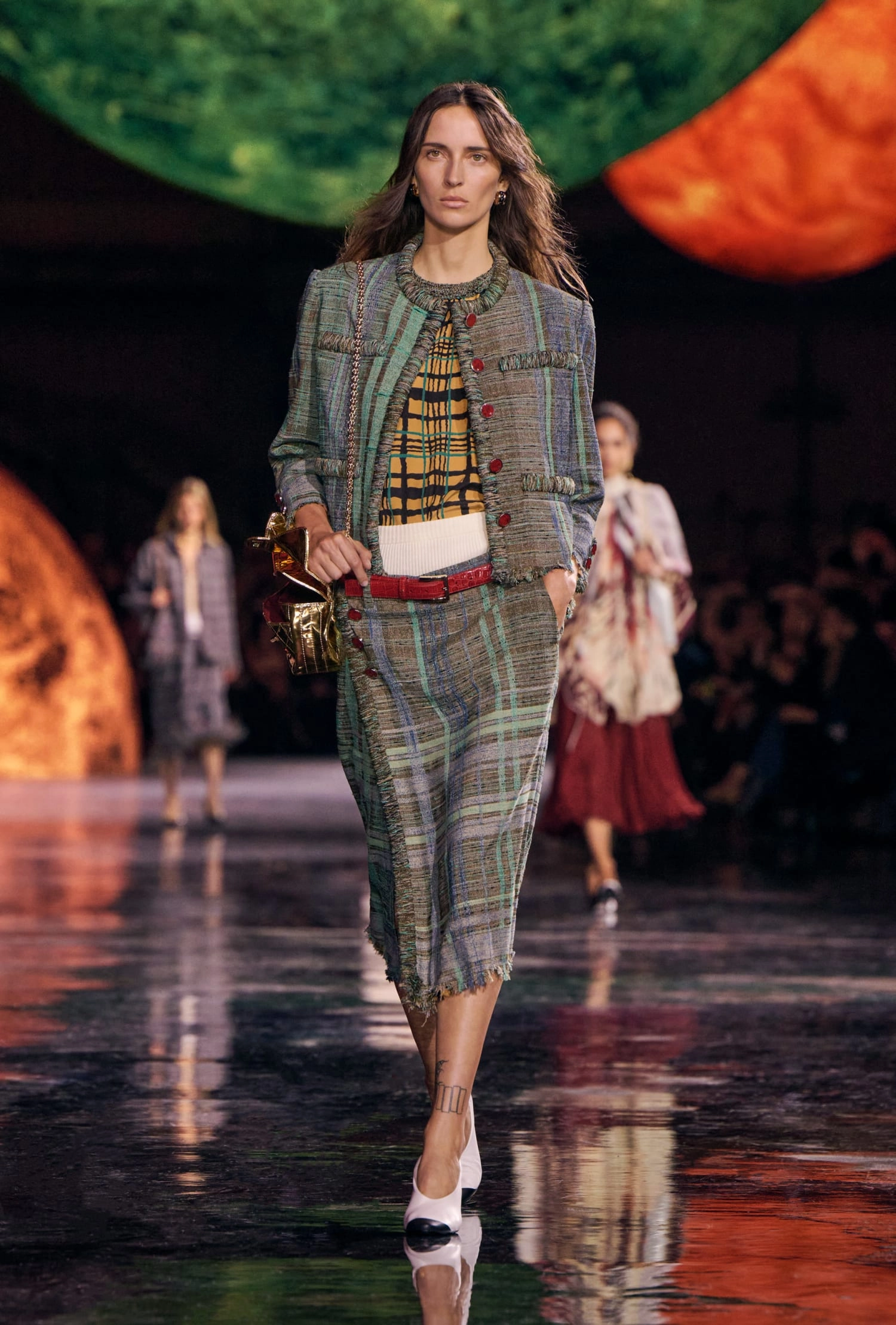 Графічні чорно-білі лінії відсилають до ар-деко та фірмового пакування Chanel – вони втілені у трикотажах. У колекції безліч твідів і плетив: твідові сітки стають ручними вузликовими плетеннями, переосмислюючи традиційний костюм Chanel.