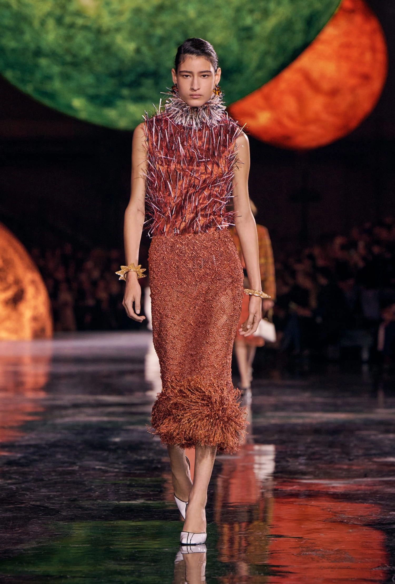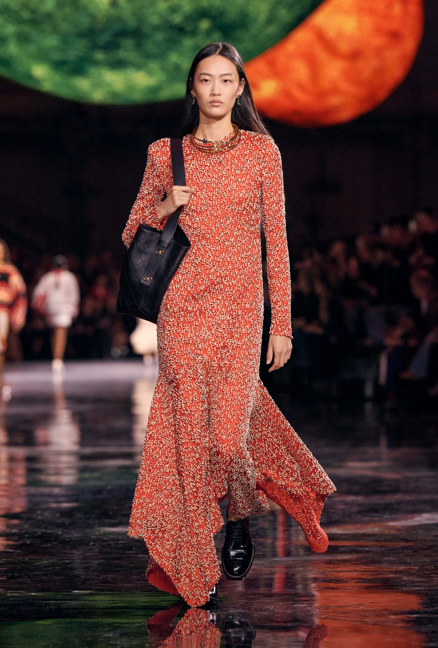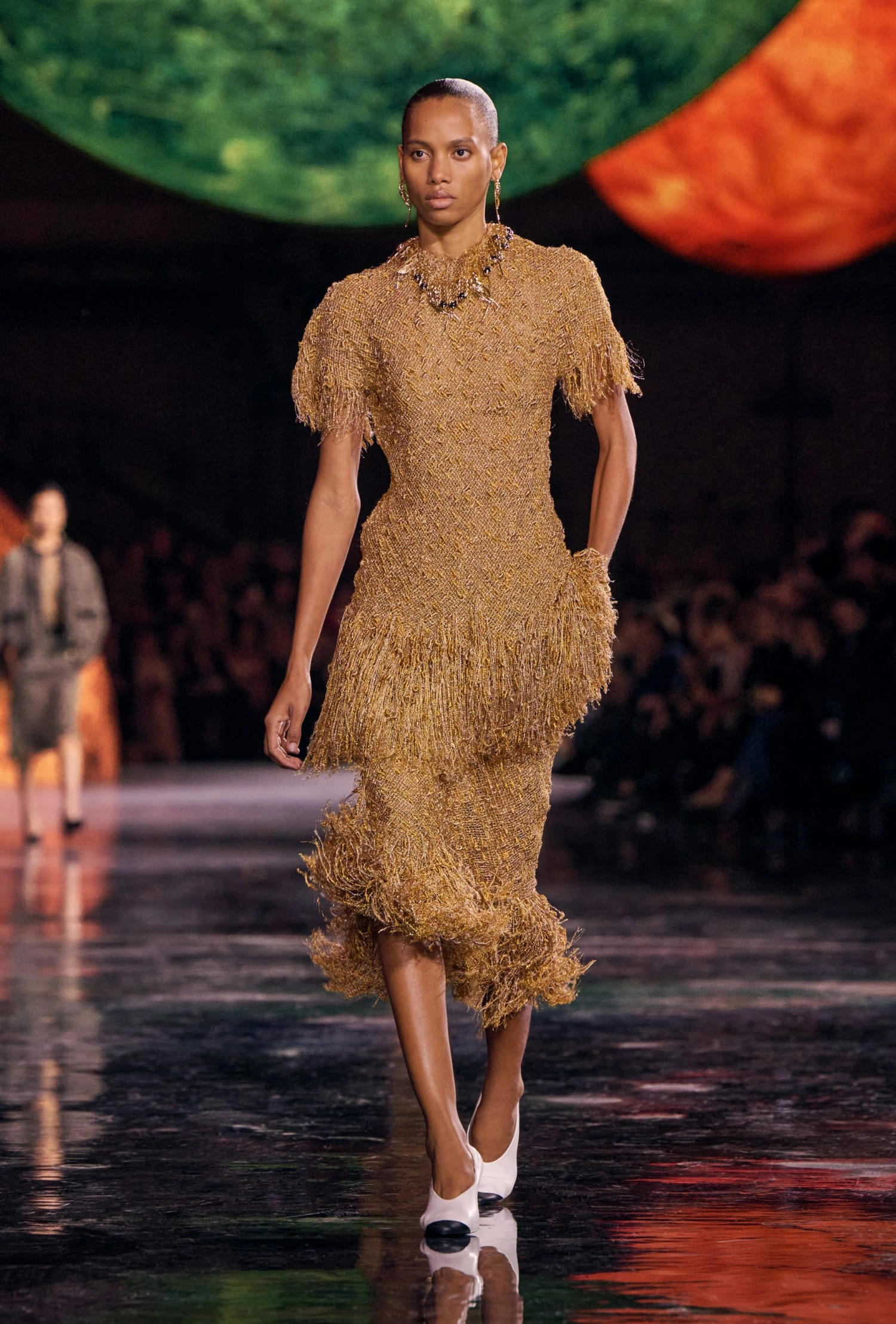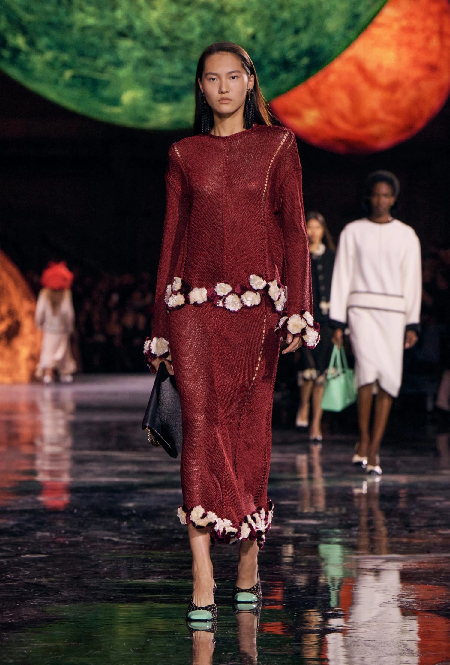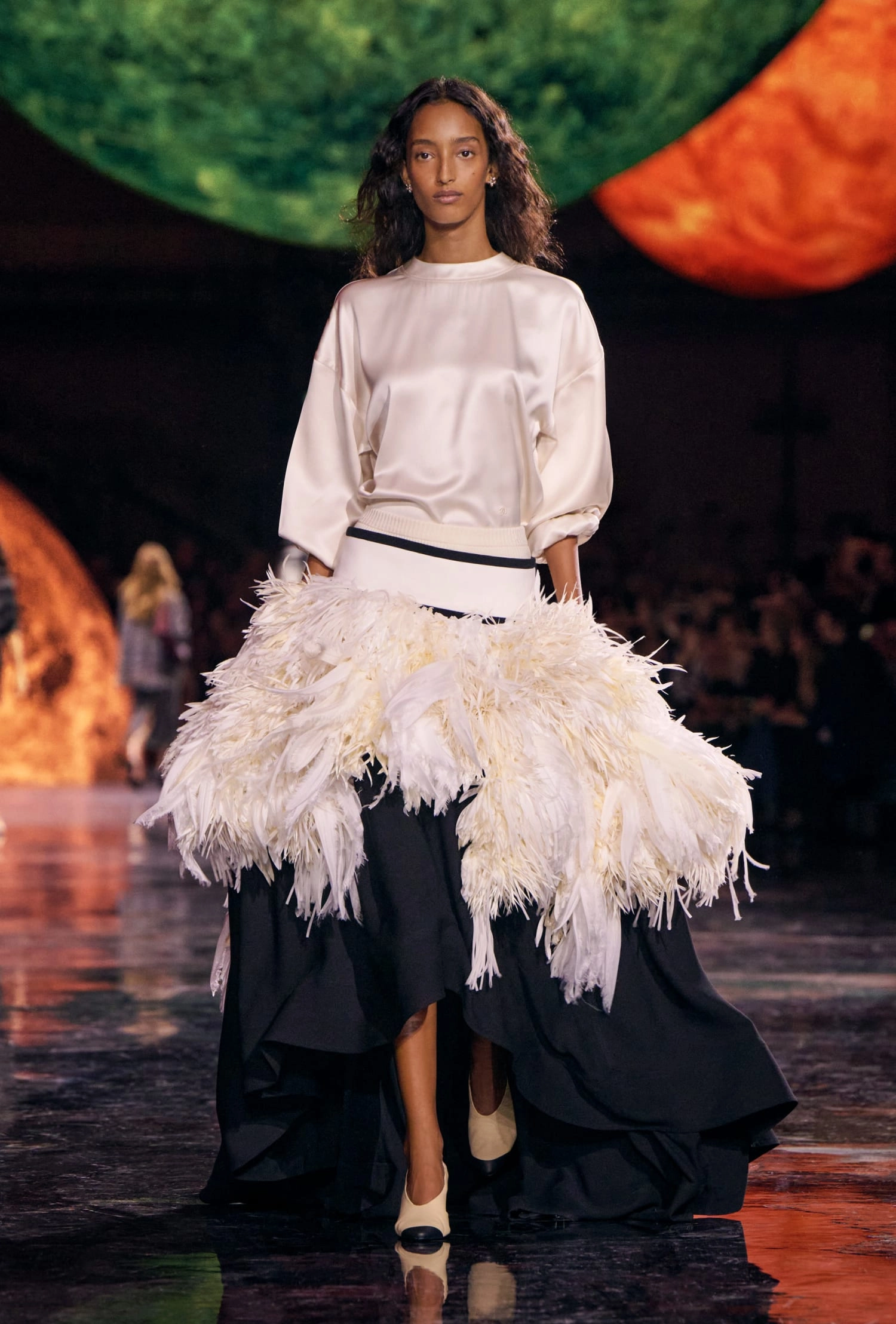 Графічні чорно-білі лінії відсилають до ар-деко та фірмового пакування Chanel – вони втілені у трикотажах. У колекції безліч твідів і плетив: твідові сітки стають ручними вузликовими плетеннями, переосмислюючи традиційний костюм Chanel.