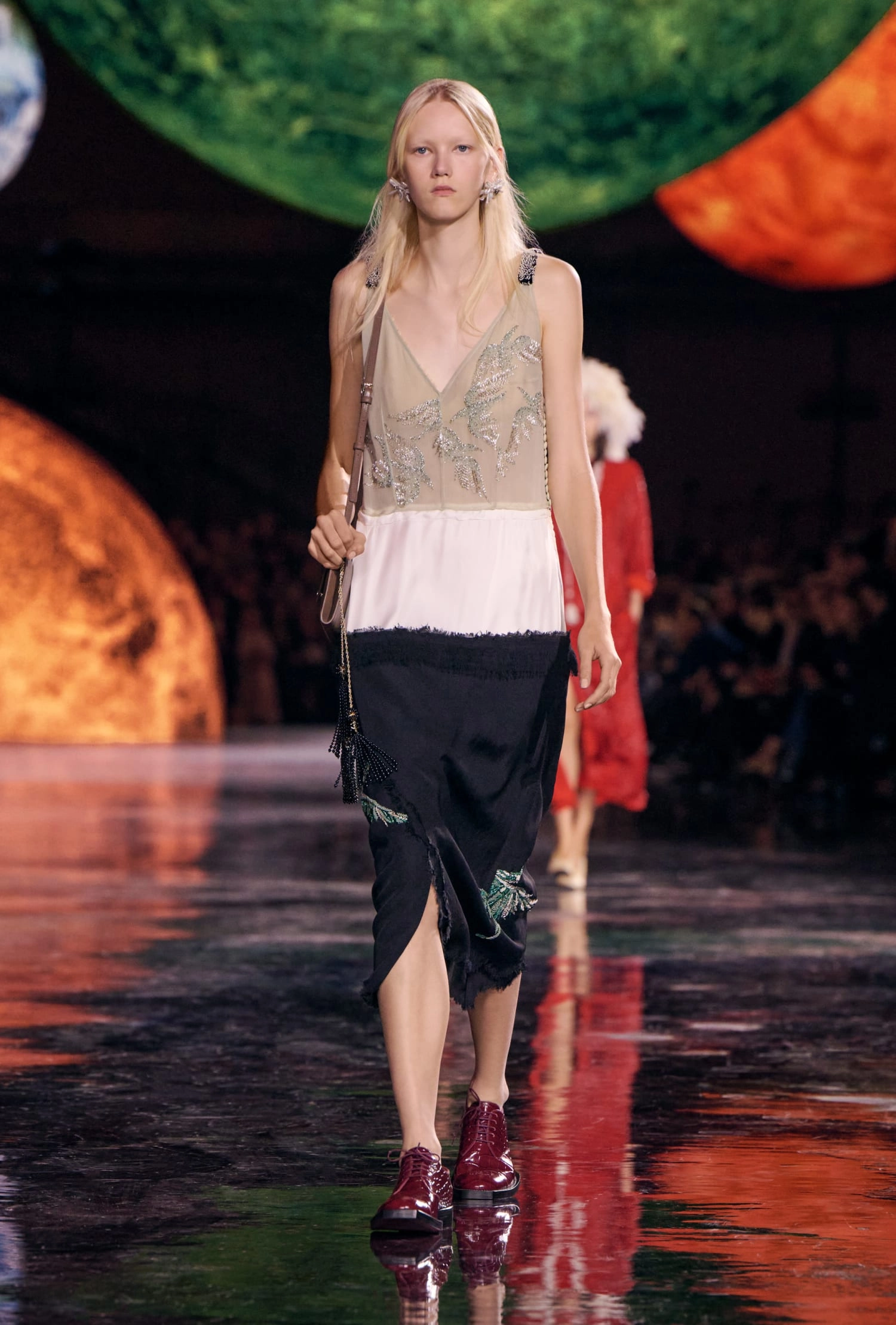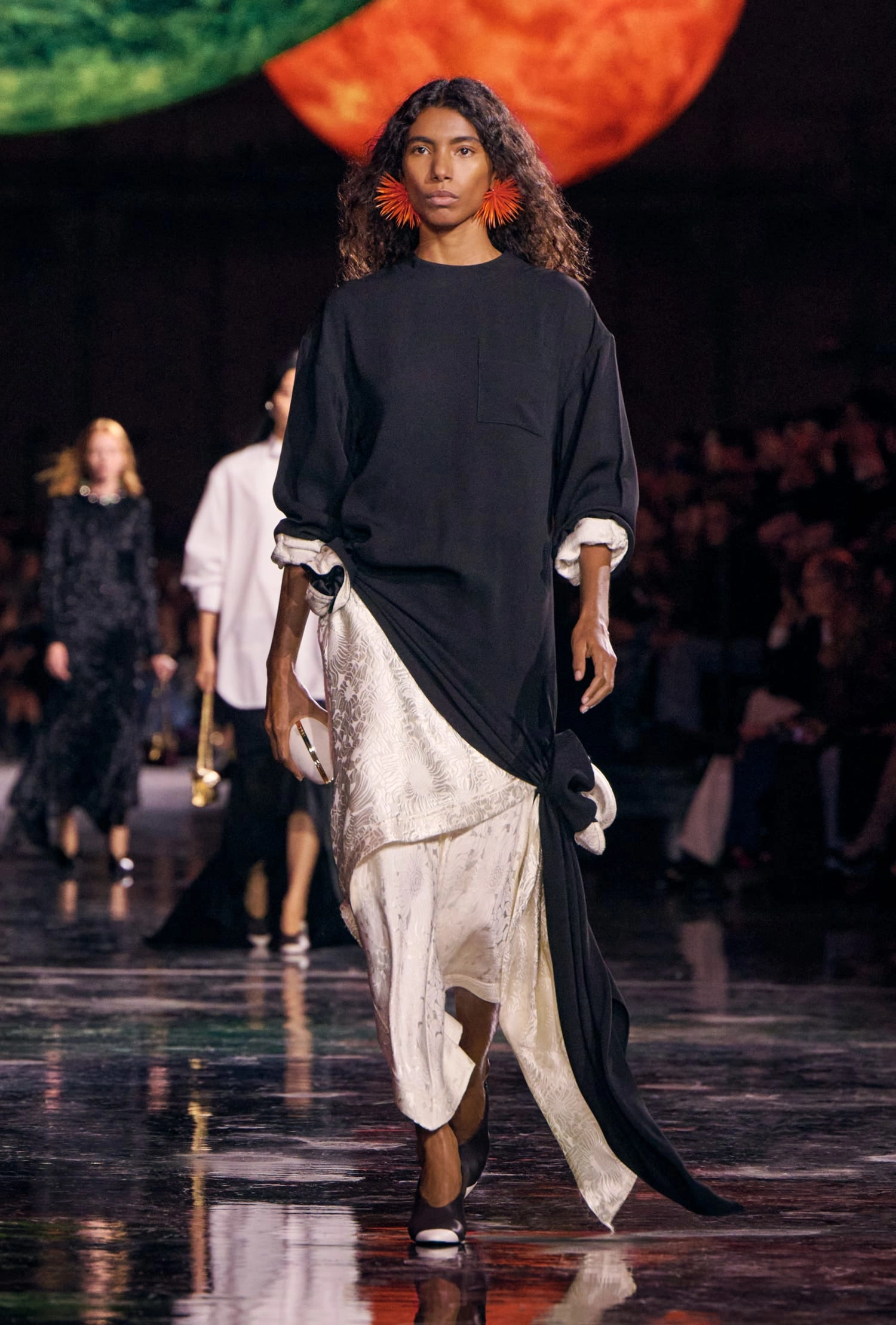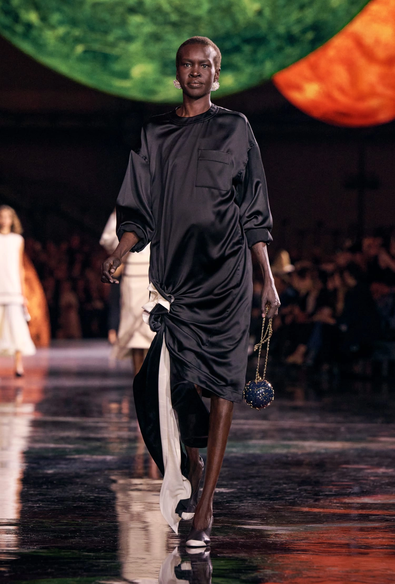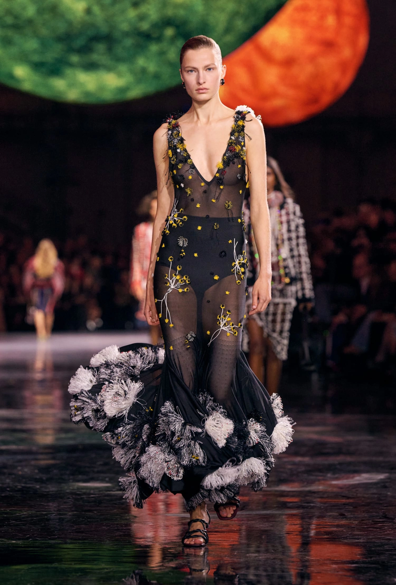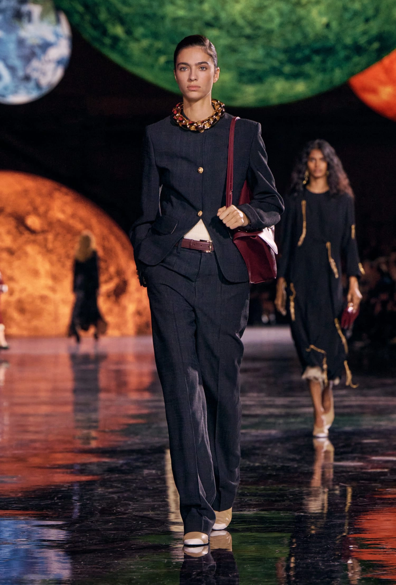 Графічні чорно-білі лінії відсилають до ар-деко та фірмового пакування Chanel – вони втілені у трикотажах. У колекції безліч твідів і плетив: твідові сітки стають ручними вузликовими плетеннями, переосмислюючи традиційний костюм Chanel.