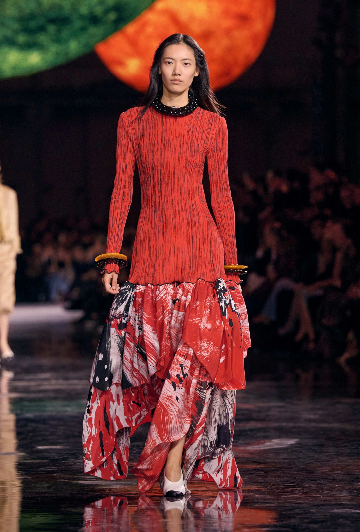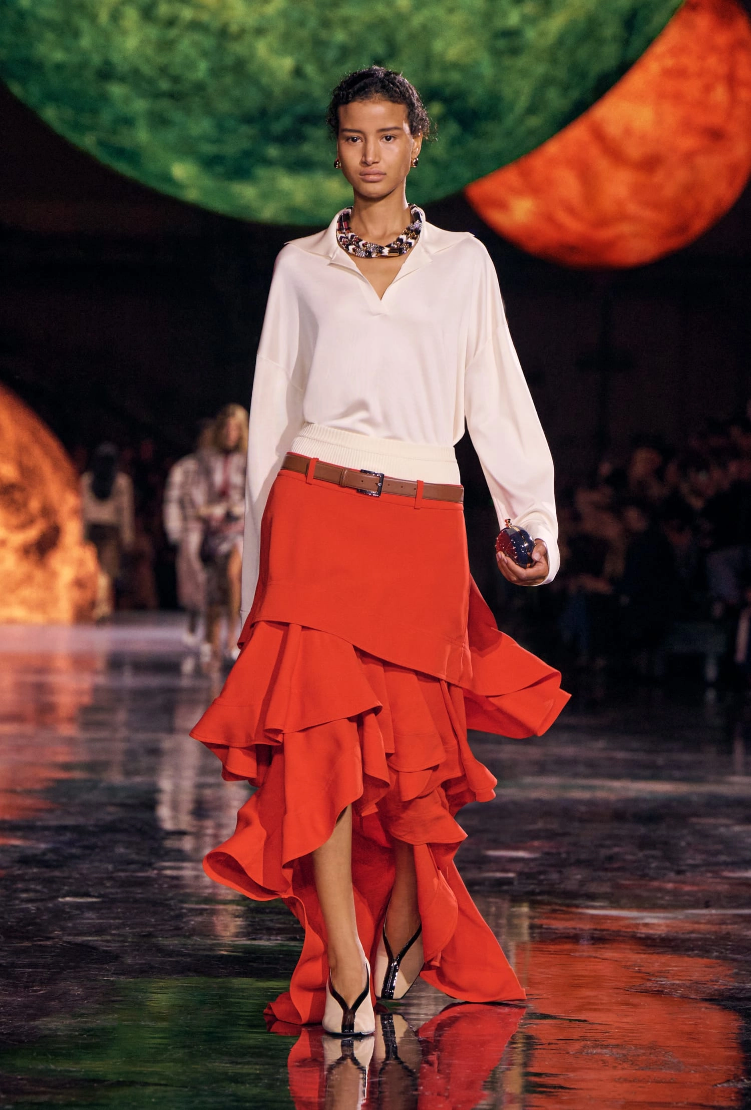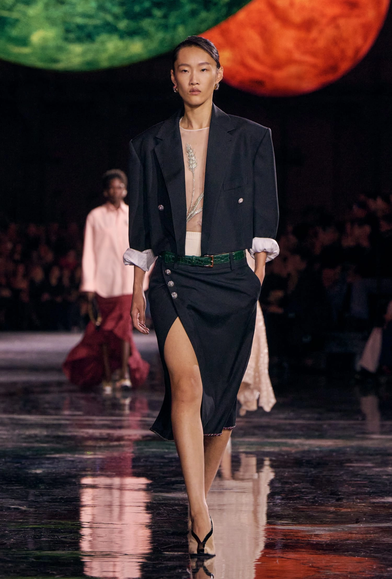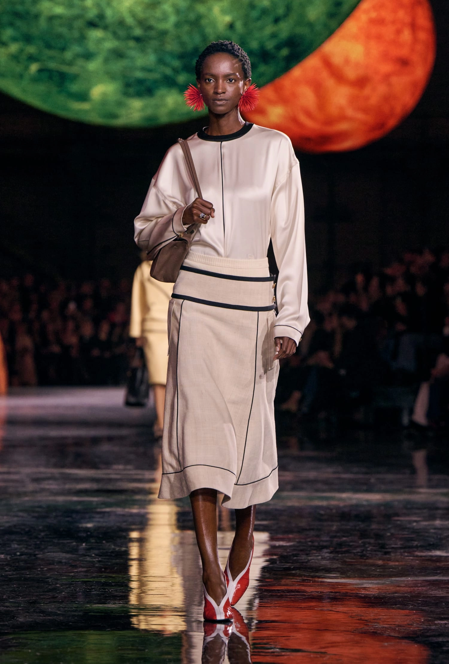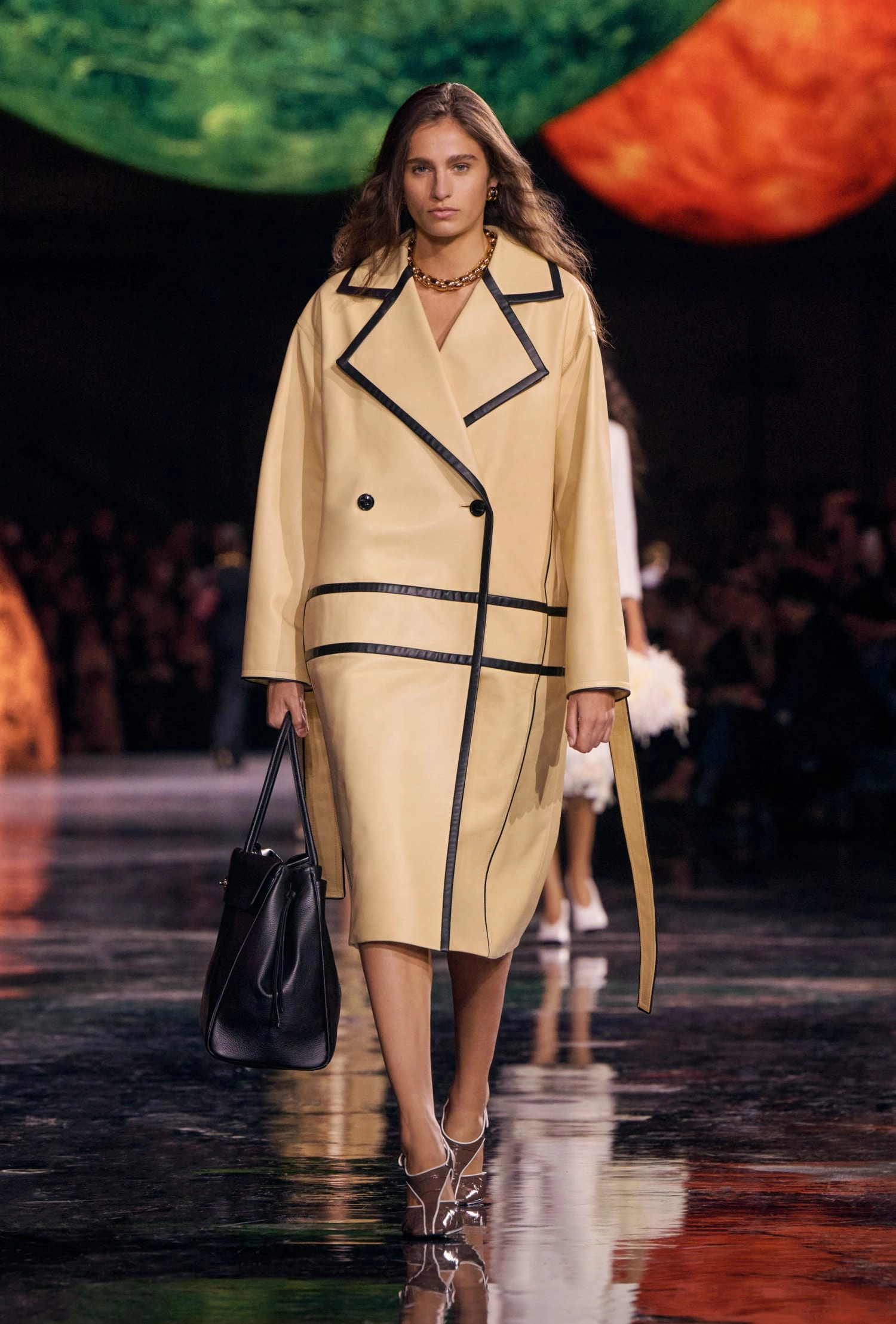 Графічні чорно-білі лінії відсилають до ар-деко та фірмового пакування Chanel – вони втілені у трикотажах. У колекції безліч твідів і плетив: твідові сітки стають ручними вузликовими плетеннями, переосмислюючи традиційний костюм Chanel.
