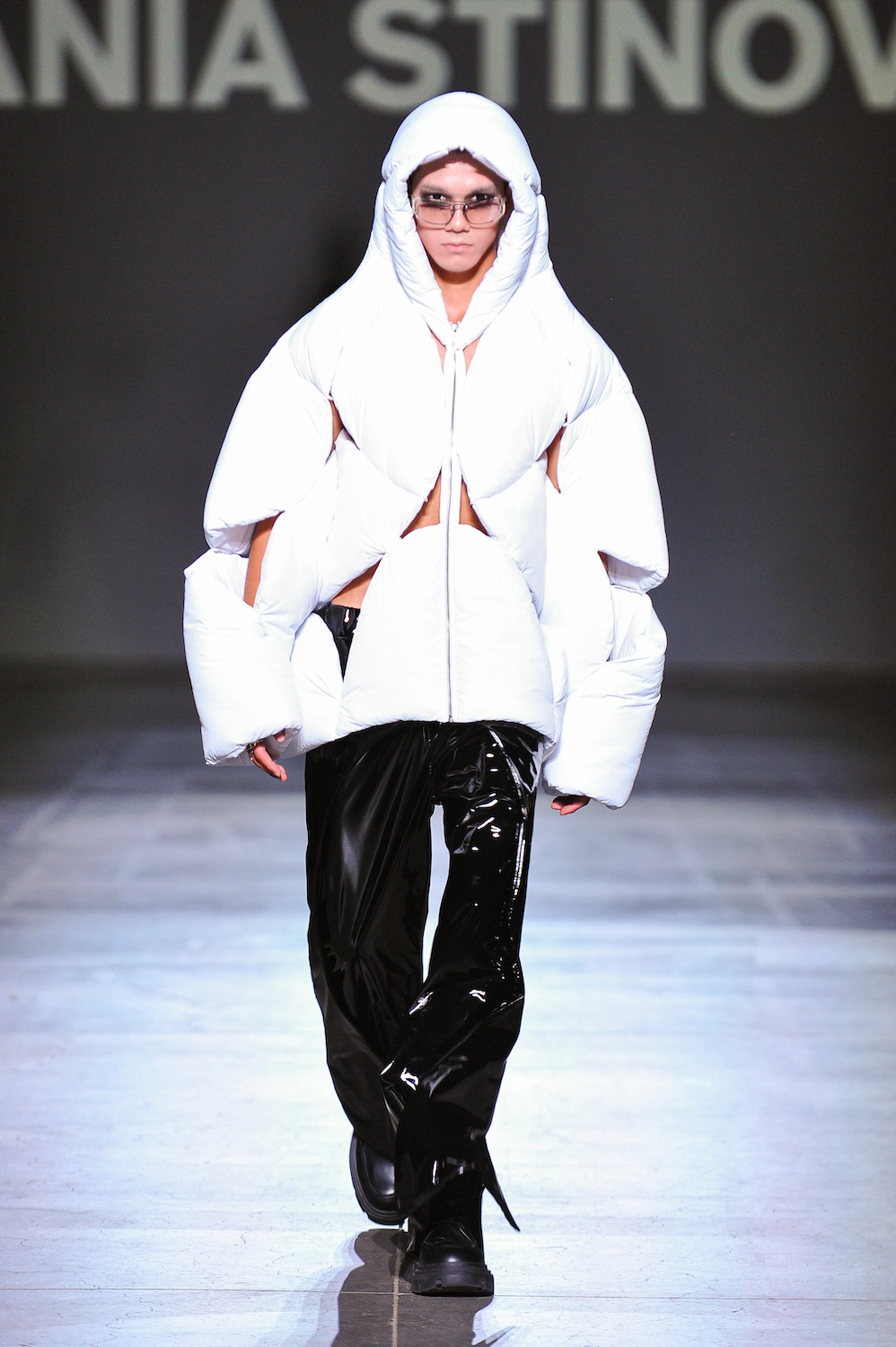 Дизайнерка поєднала чисті форми з новими конструктивними рішеннями. Так, у деяких меделях плечовий шов переходив у капюшон, балаклава повністю закривала обличчя, а пуховик оголював торс. Усі образи були спершу створені в 3D, а потім втілені фізично. Це зробило конструкції та пропорції абсолютно точними.