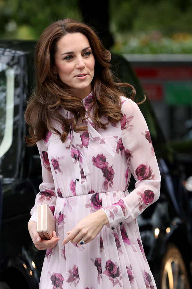 До сукні ніжно-рожевого відтінку Кейт підібрала замшеві бежеві човники від Gianvito Rossi і маленький клатч від LK Bennet Nina Trench Clutch. Завершальними штрихами образу стали акуратний макіяж та об’ємна зачіска з легкими хвилястими локонами.