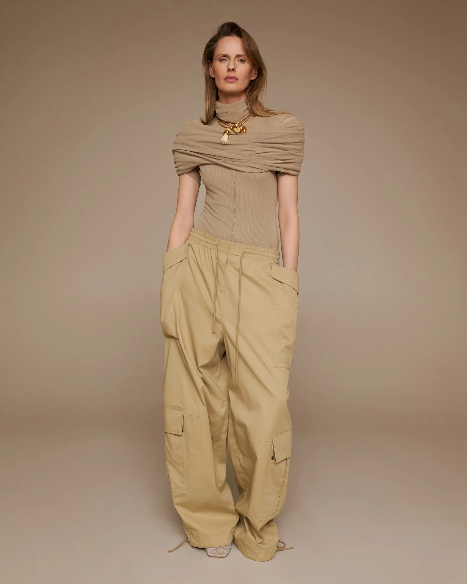 Колірна палітра — це пейзажі природи: солоні рожеві озера, пісок дюн, візерунки морського дна. Мʼяка шкіра, японська матова сітка, фемінність з об’ємними силуетами — від карго-брюк до тренчів-коконів — балансують на межі між ніжністю й захистом. У цій колекції ДНК бренду розкривається через нову жіночність: утилітарну, сміливу, позачасову.