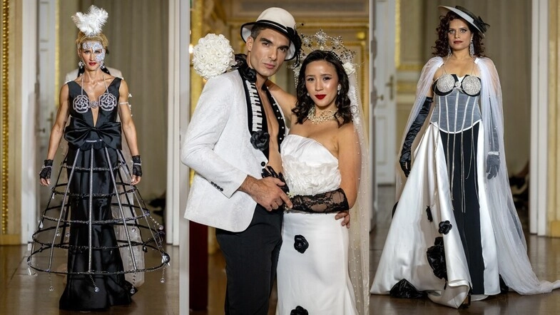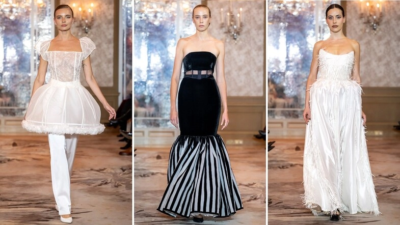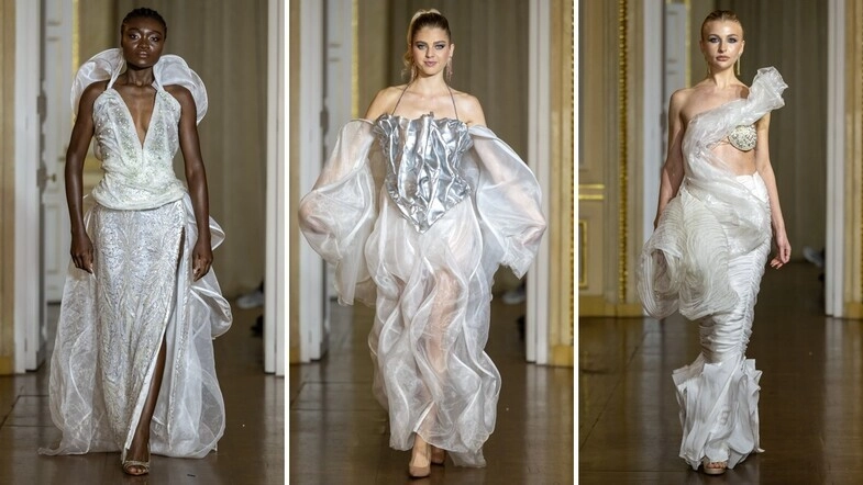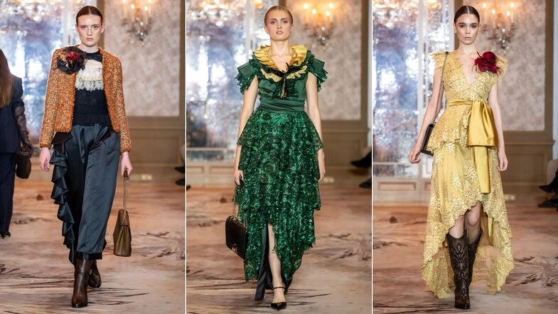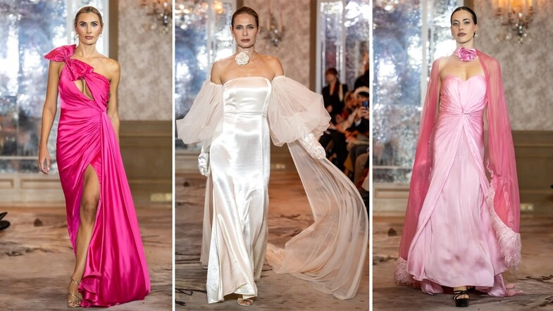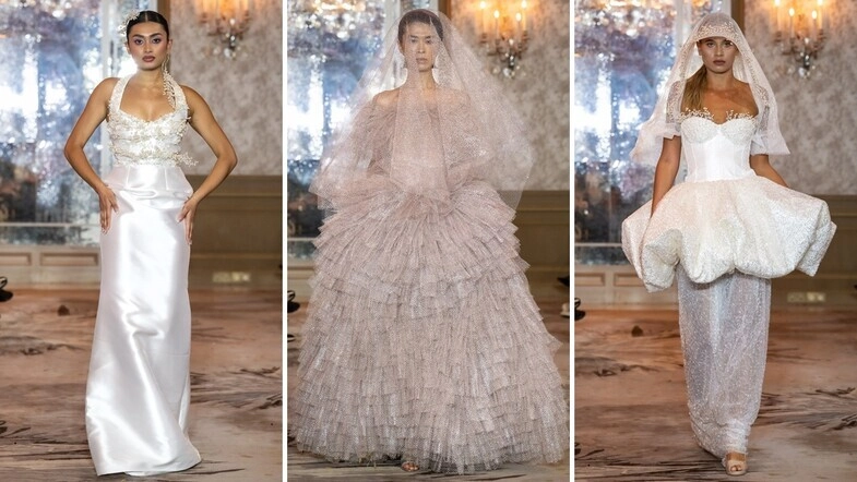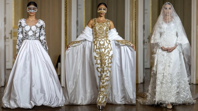 Від ніжних шовків кольору слонової кістки та золотих металізованих тканин до контрастів яскравої фуксії та кольору нагідок — кожен образ оспівував величність церемоніального вбрання, поданої крізь призму сучасної, інтернаціональної чуттєвості.