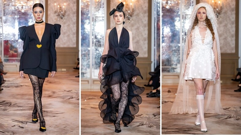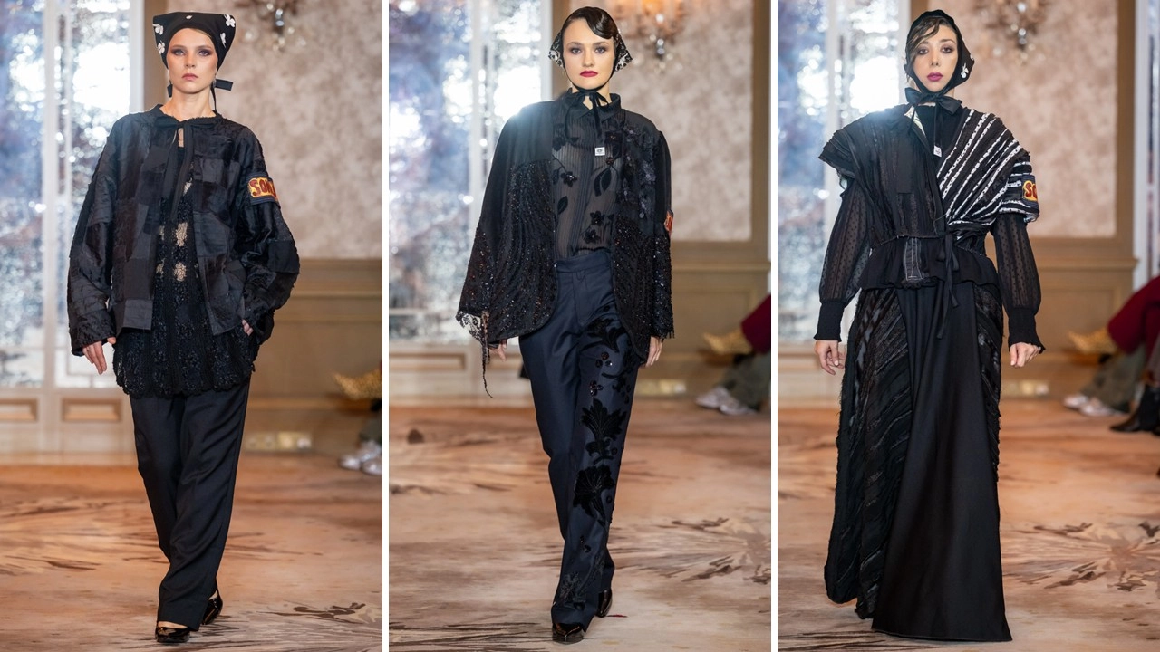 Колекція Kharchi вийшла на паризький подіум мов беззвучний гімн — оповита глибокими відтінками чорного, багатошаровими текстурами та скульптурними силуетами, які поєднали в собі предковічність і авангард. Стьобані жакети, зібрані спідниці, вуалеві головні убори та ручне нашивання патчворку переосмислили елементи грузинської спадщини з сучасною, майже церемоніальною аурою.