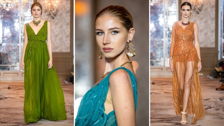 Сміливі акцентні прикраси — від скульптурних чокерів і каскадних сережок із дорогоцінним камінням до аксесуарів для волосся, натхненних природними формами — поєднувалися з летючими сукнями в смарагдовому, розплавленому золоті та вогняно-червоних відтінках, створюючи образи, які сяяли рухом і змістом.