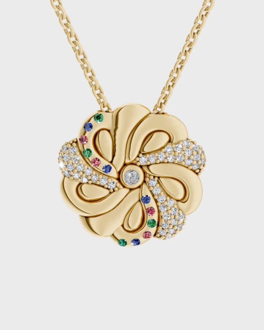 Підвіски виконані з золота 585 проби, інкрустовані діамантами та сапфірами, а також покриті ювелірною емаллю.