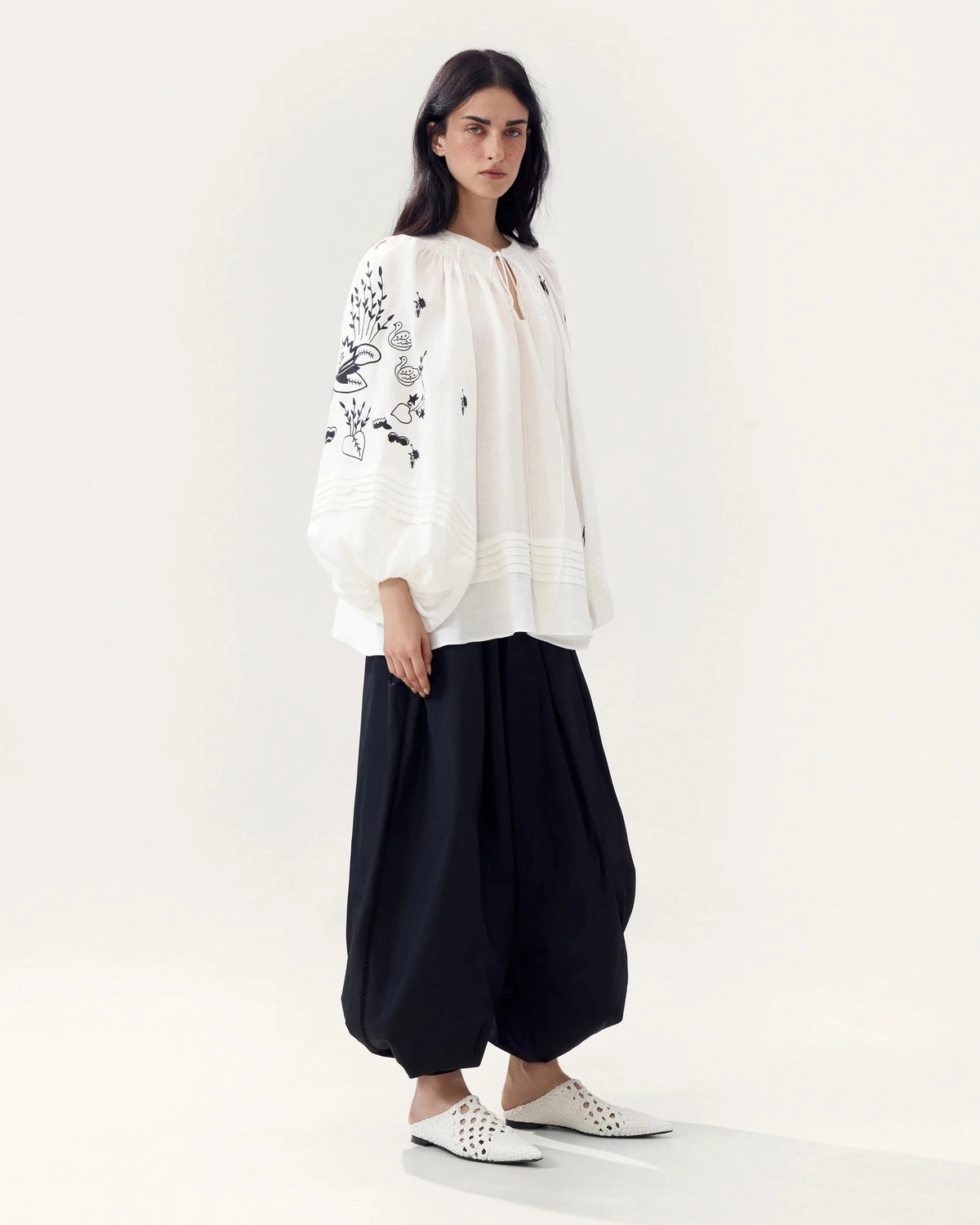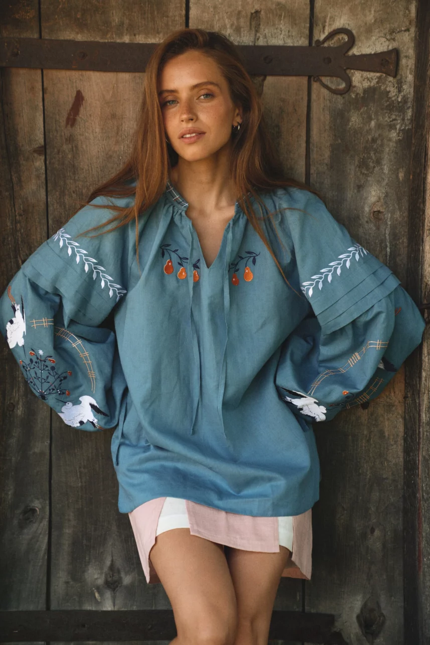 Лляна сорочка «Віринея» від бренду Gunia Project має об’ємні рукави, дрібне драпування за мотивами автентичної техніки рясування. Дизайн візерунків натхнений наївними рушниками XX сторіччя. Сорочку можна носити як повсякденний чи святковий елемент вбрання.