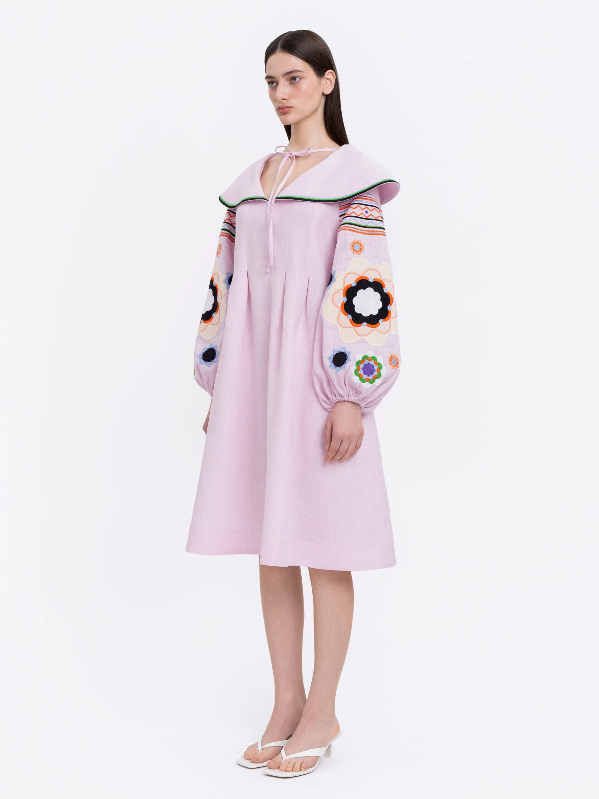 А як вам ця ніжно-рожева сукня міді з розлогим коміром? Її Відтінок немов зійшов з рум’янцю дівочих щік, який так часто змальовував художний Андрій Коцка. На льоні ніжного кольору особливо виразно розкривається барвиста вишивка з елементами аплікації. Вона прикрашає рукави, а також окреслює межі коміра. Святково й жіночно!