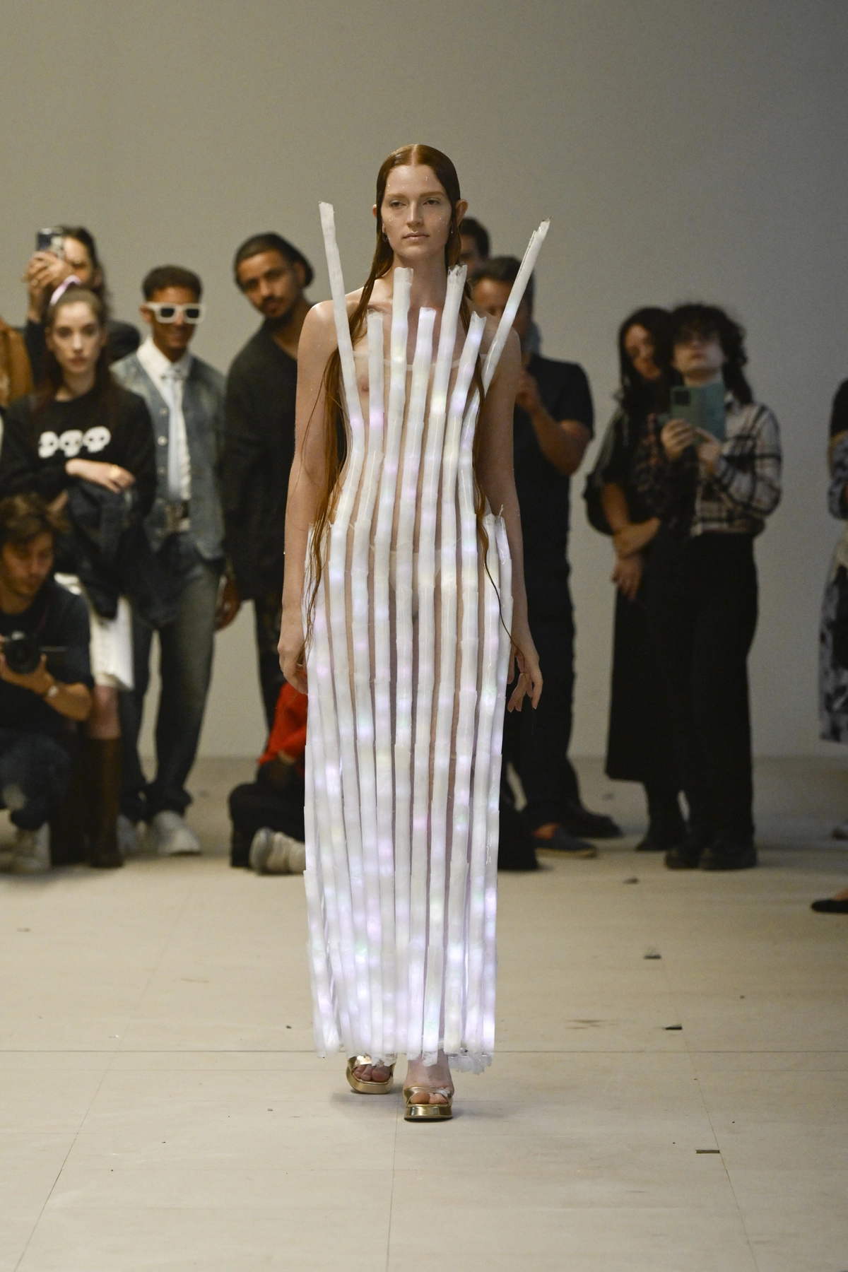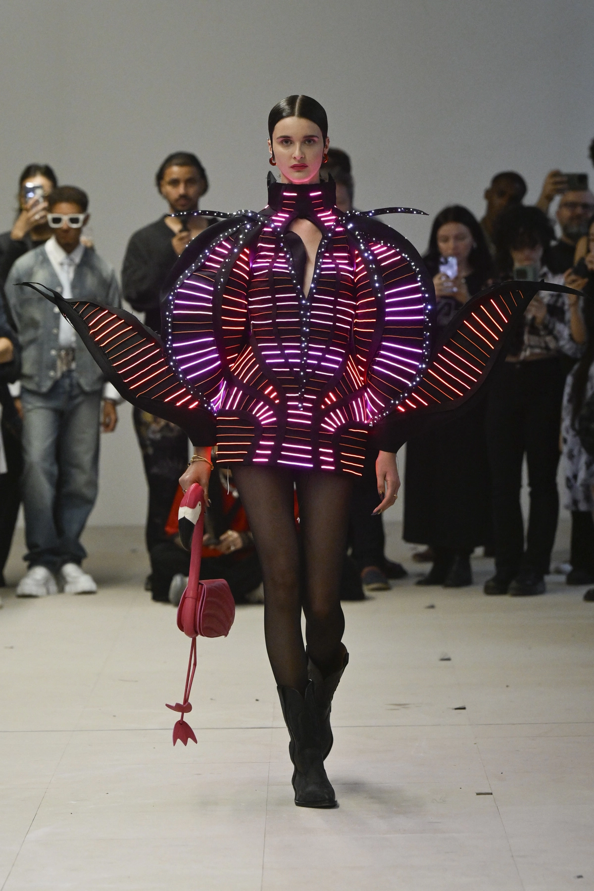 Клара Дагуен перетворює Лас-Вегас, з міста ілюзій, на подіум. Її «Стріп» символізує подвійність між блиском і самопізнанням. Натхненна естетикою казино та кабаре, дизайнерка створює техно-тотеми — костюми, де пір’я та паєтки переплітаються з оптоволокном і світловими схемами.