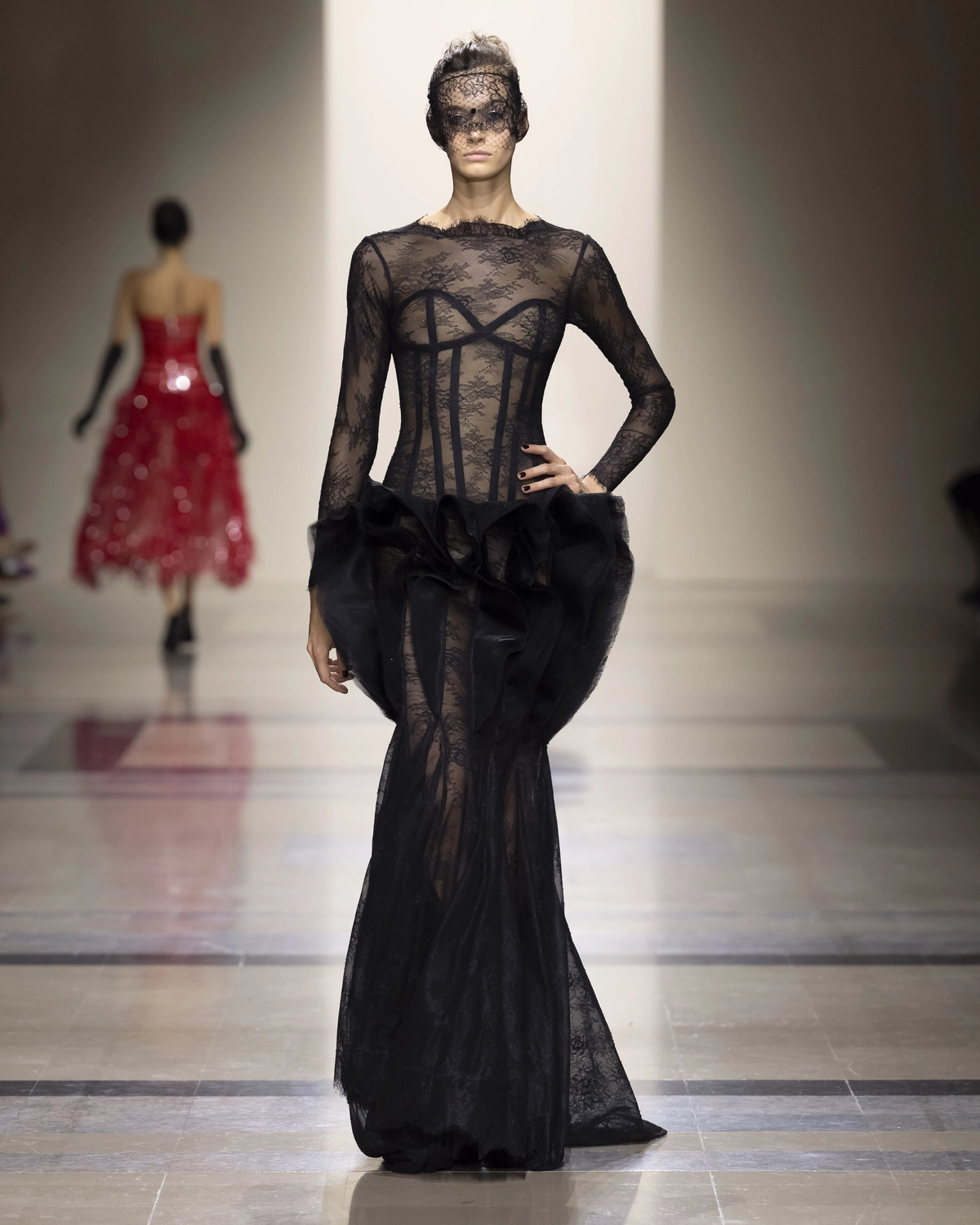 Колекція витримана в переважно чорному — від крепу і газу до атласу і шифону, при цьому яскраво-червоні акценти надають драматизму.