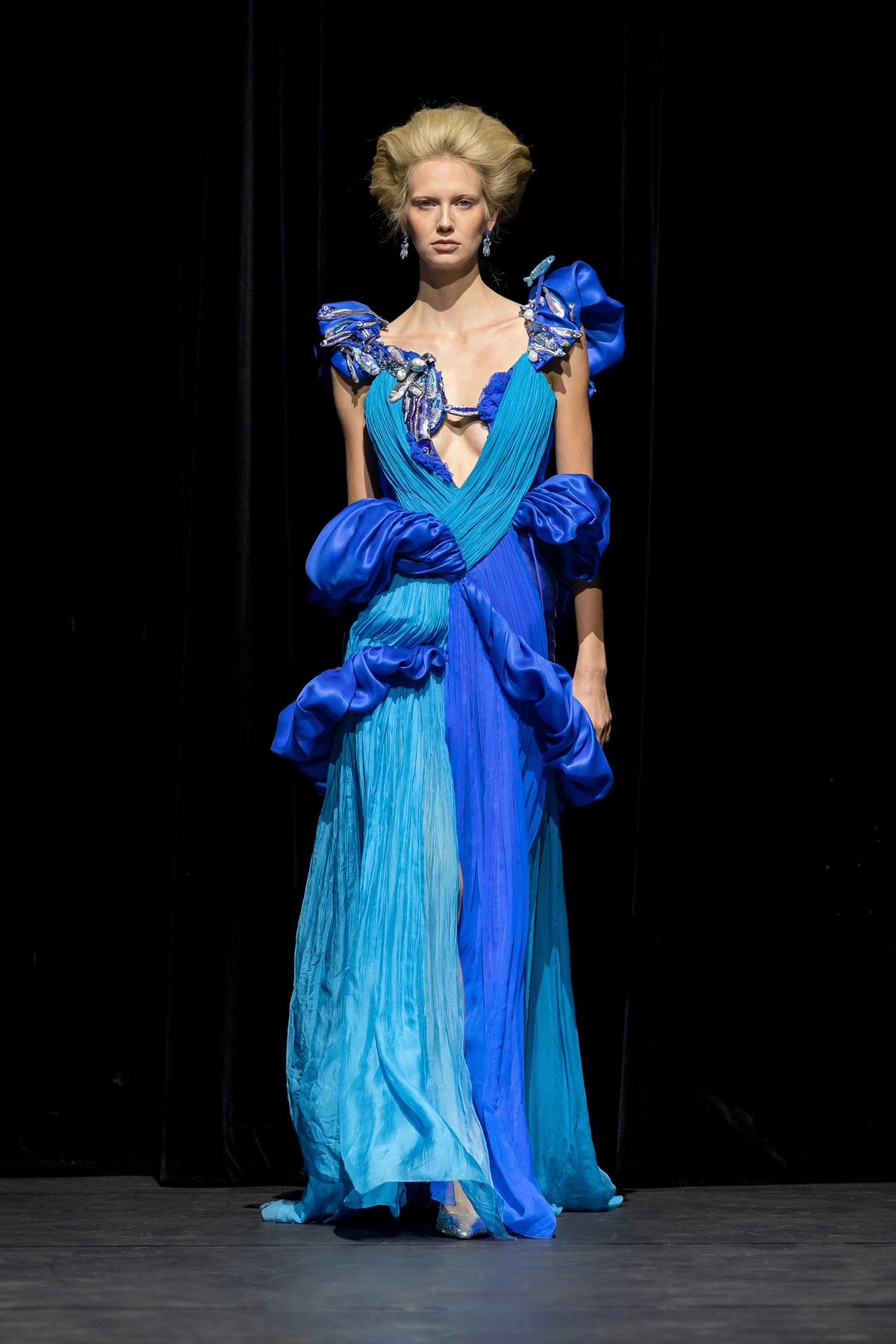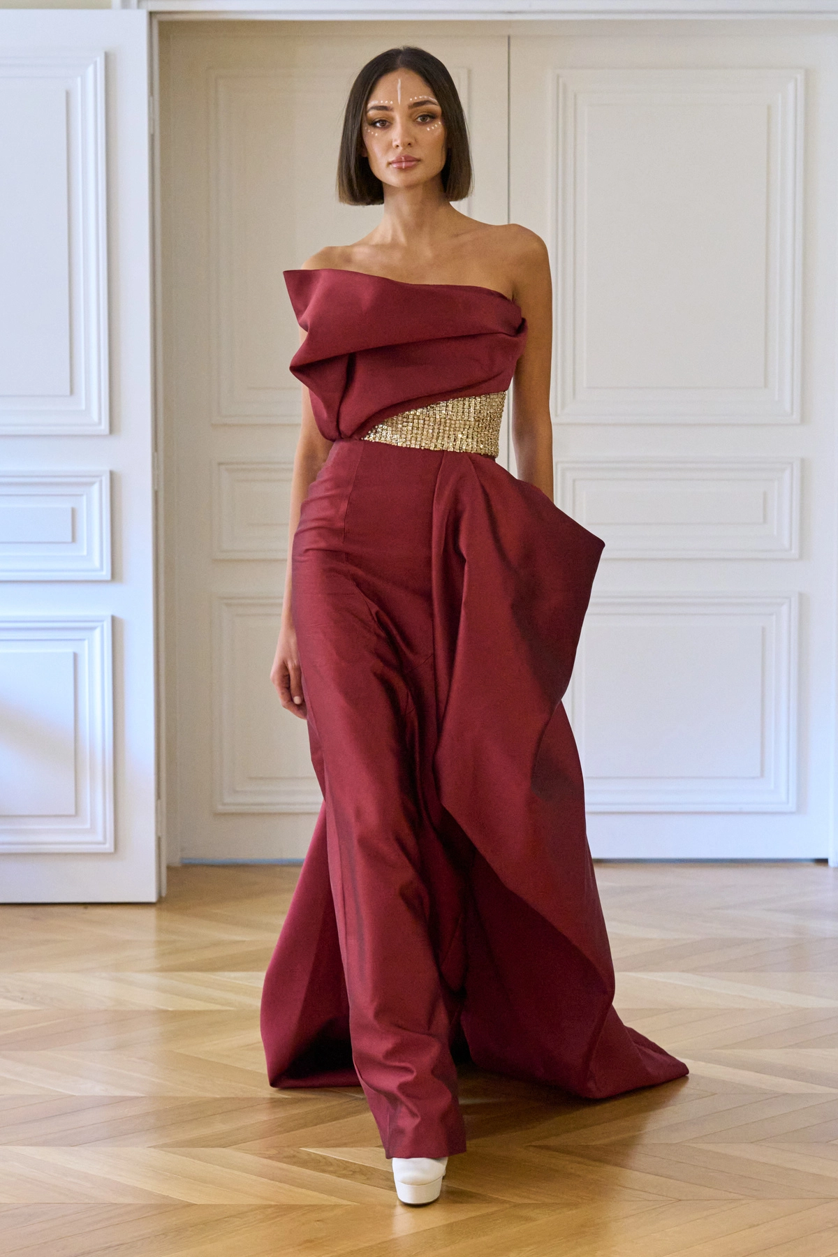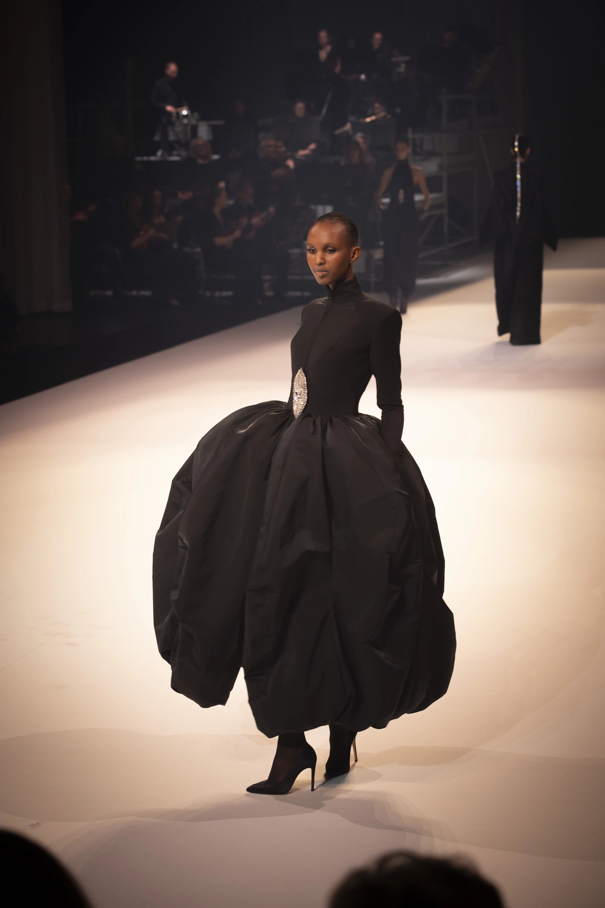 Силуети вражають архітектурною сміливістю: сукні з відкритою спиною і графічними комірами, смокінги з перебільшеними лацканами, об’ємні комбінезони з напівкруглими брюками та пальто-матадори, прикрашені складною вишивкою.