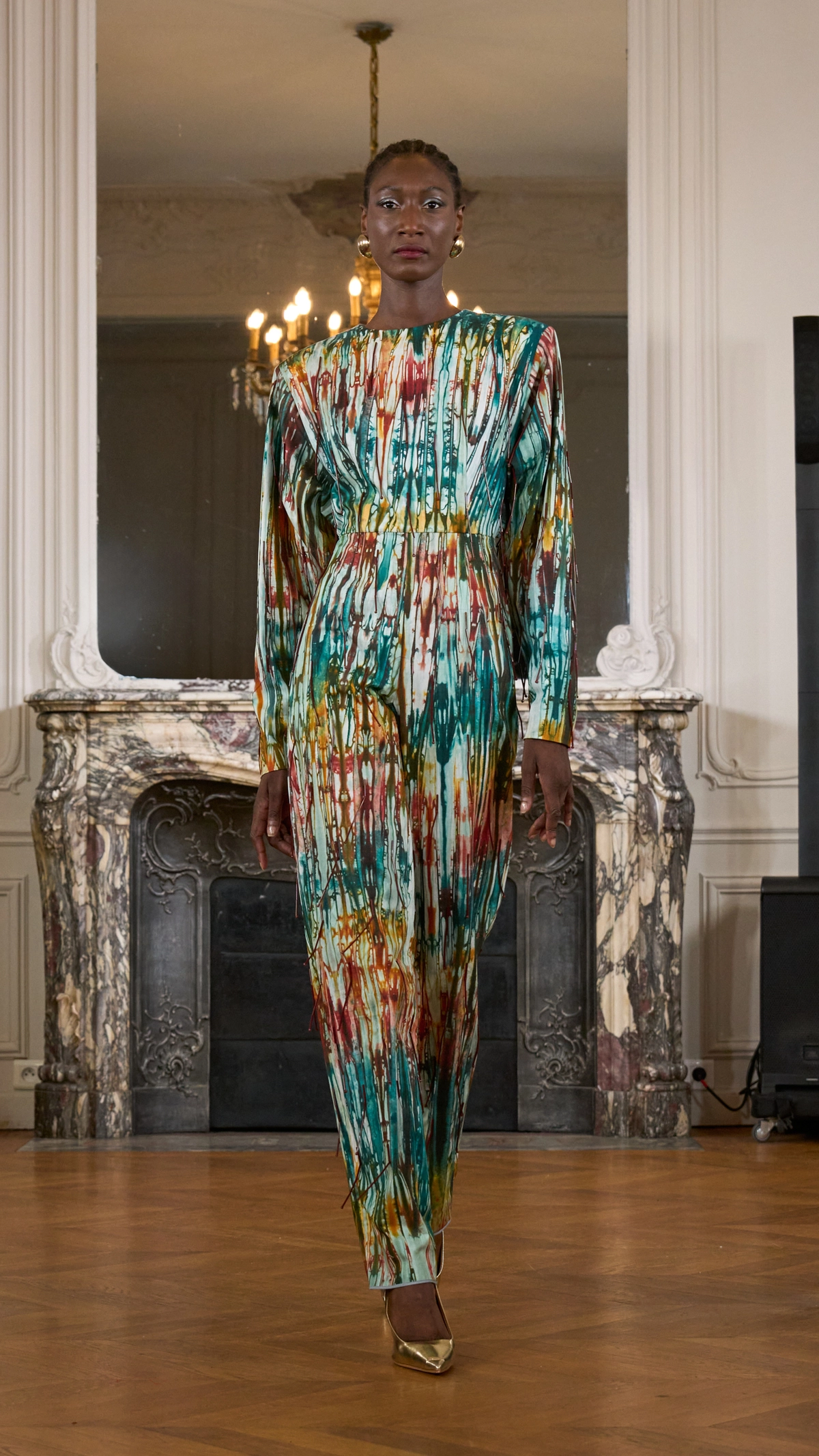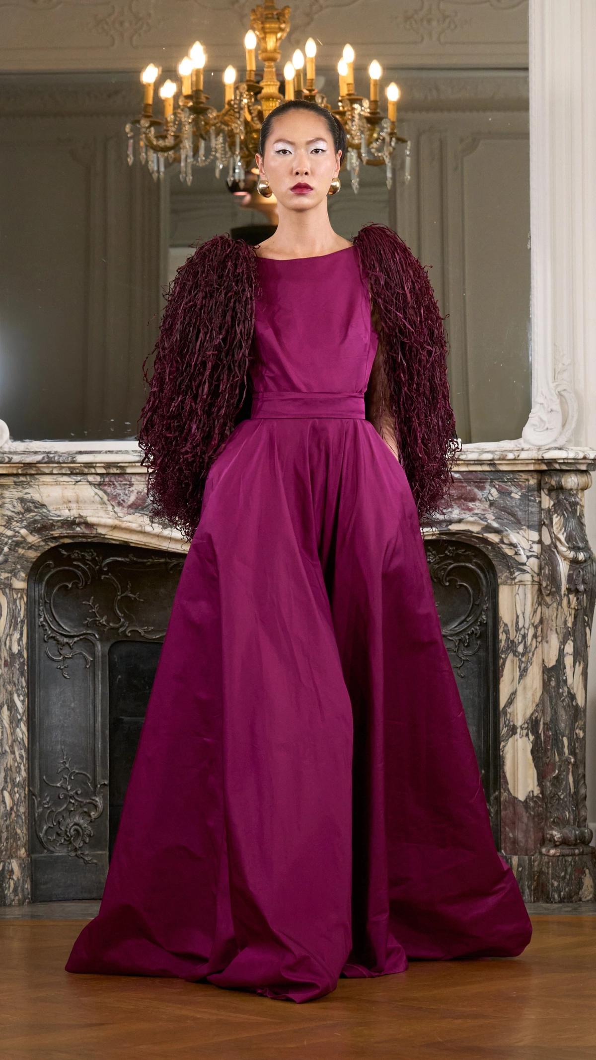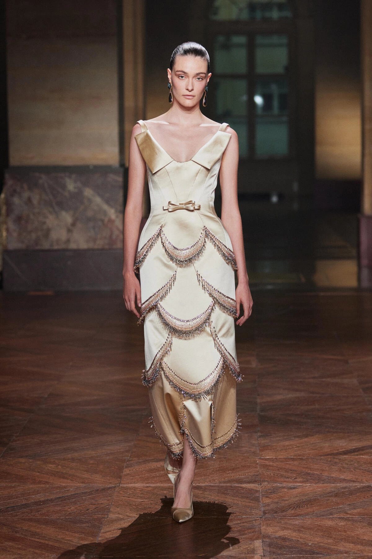 Силуети вражають архітектурною сміливістю: сукні з відкритою спиною і графічними комірами, смокінги з перебільшеними лацканами, об’ємні комбінезони з напівкруглими брюками та пальто-матадори, прикрашені складною вишивкою.