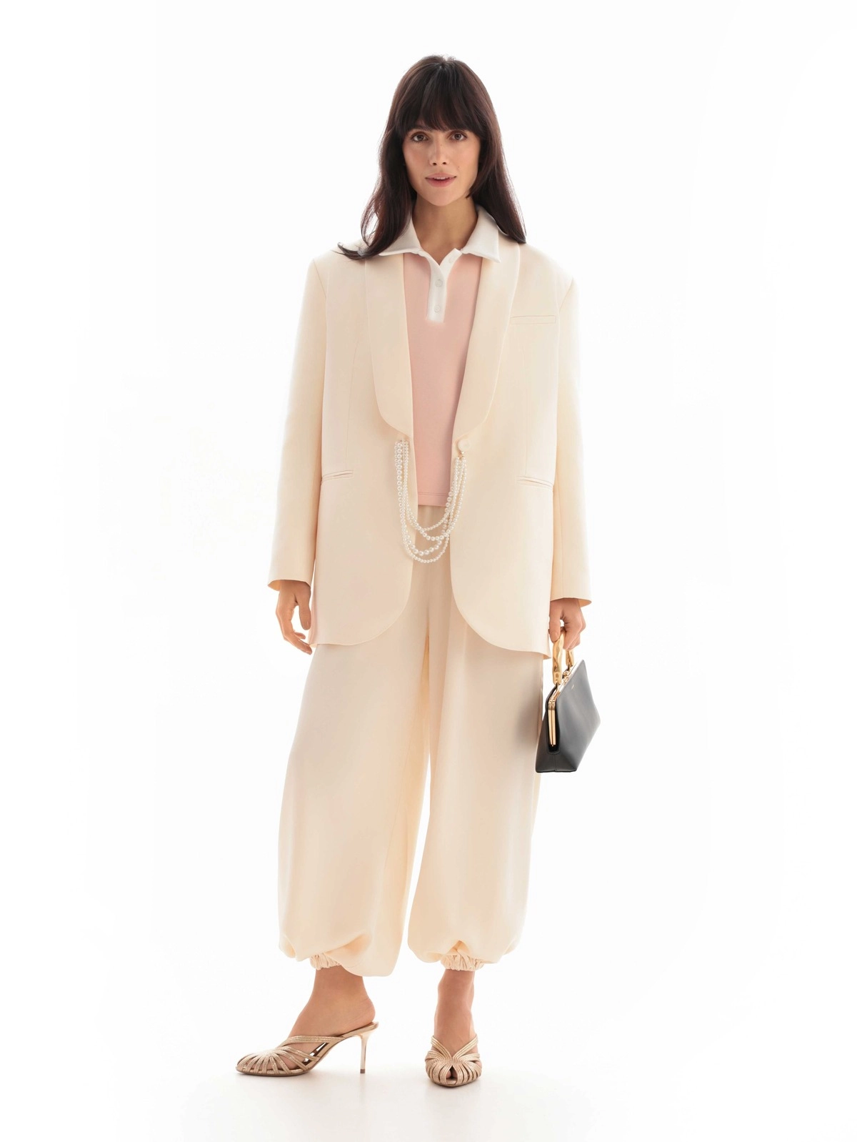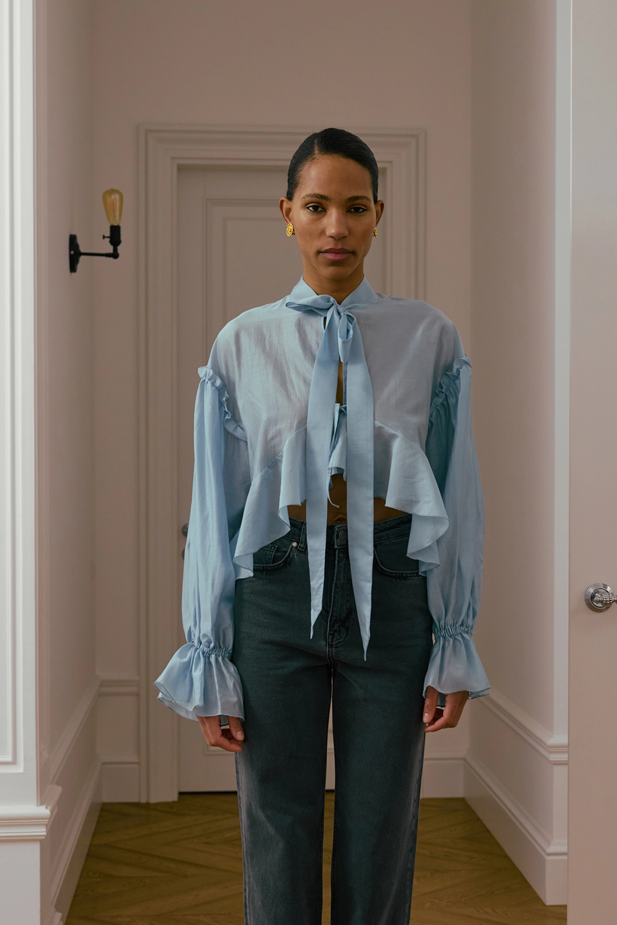 Наступний мастхев — романтична блуза. Вона зачаровує своїми деталями: об’ємні рукава, кокетливі рюші, мереживні вставки, делікатна вишивка або зав’язки замість ґудзиків створюють вишукану, трохи ностальгічну естетику. Найефектніший вигляд такі блузи мають у світлій нейтральній палітрі — білосніжний, кремовий, пісочний: ці відтінки універсальні й легко поєднуються з будь-яким низом.