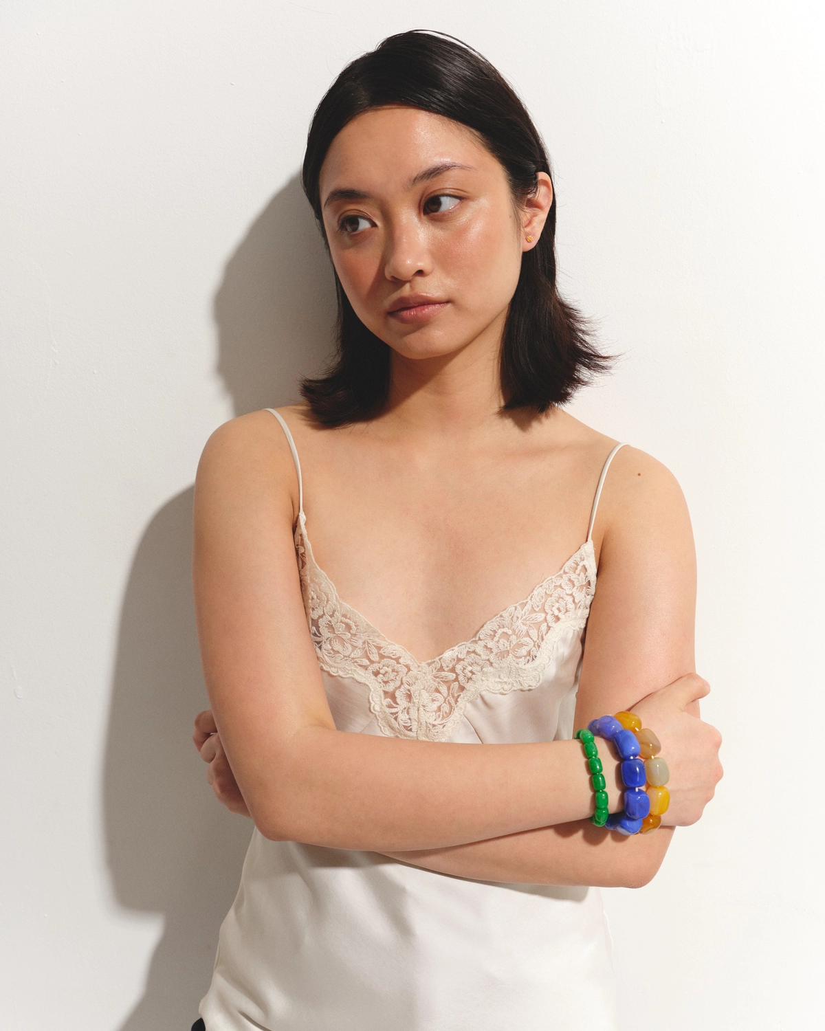 Silky Tales — нова лінія прикрас бренду, що звертається до східної естетики через форми та текстури. Її центральним елементом стала діадема Dalida — головний убір із витонченою арабескою. Іконічна підвіска-хрест Lullaby була представлена в новій палітрі кольорів: насиченому зеленому, персиковому та темно-коричневому. Бестселер бренду — сережки Ewer — повернувся у лаконічнішій формі. Так, бренд відтворив мінімалістичну, але водночас виразну і впізнавану основу для щоденних образів.