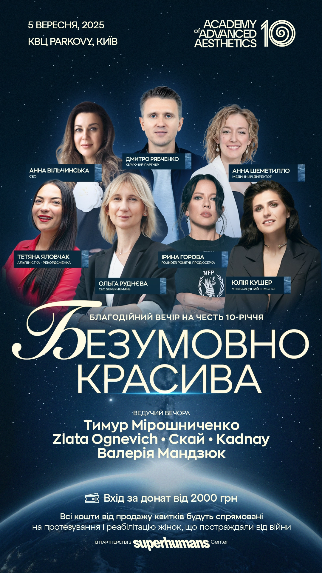 - Благодійний вечір Academy of Advanced Aesthetics — 5 вересня в КВЦ Parkovy у Києві команда відзначатиме 10-річчя Академії.