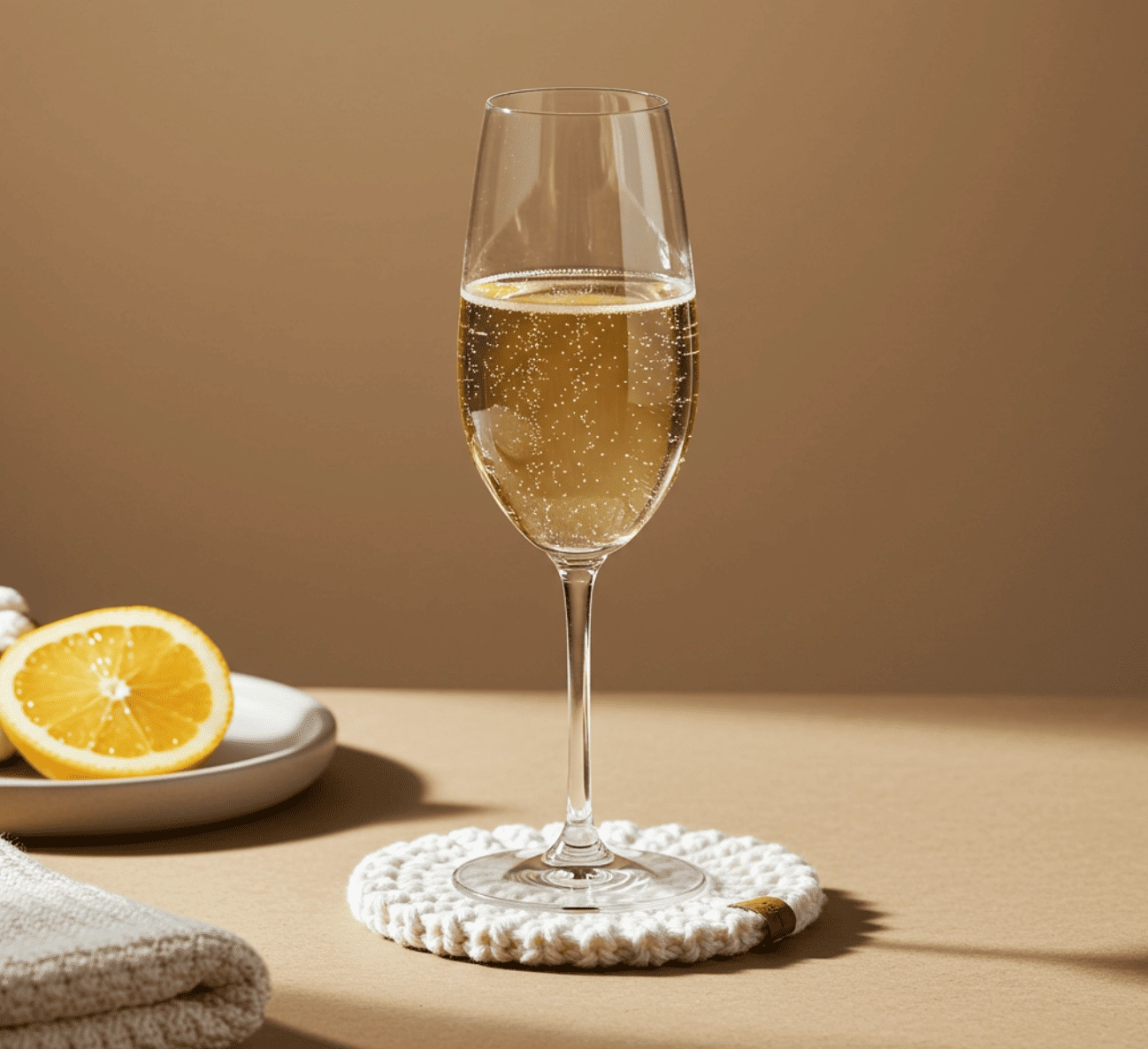 Будь ласка, згенеруй зображення для ідеї рекламного постера бренду Fil du Soleil з зображенням продукту — бавовняного в’язаного костера-підставки під келих.