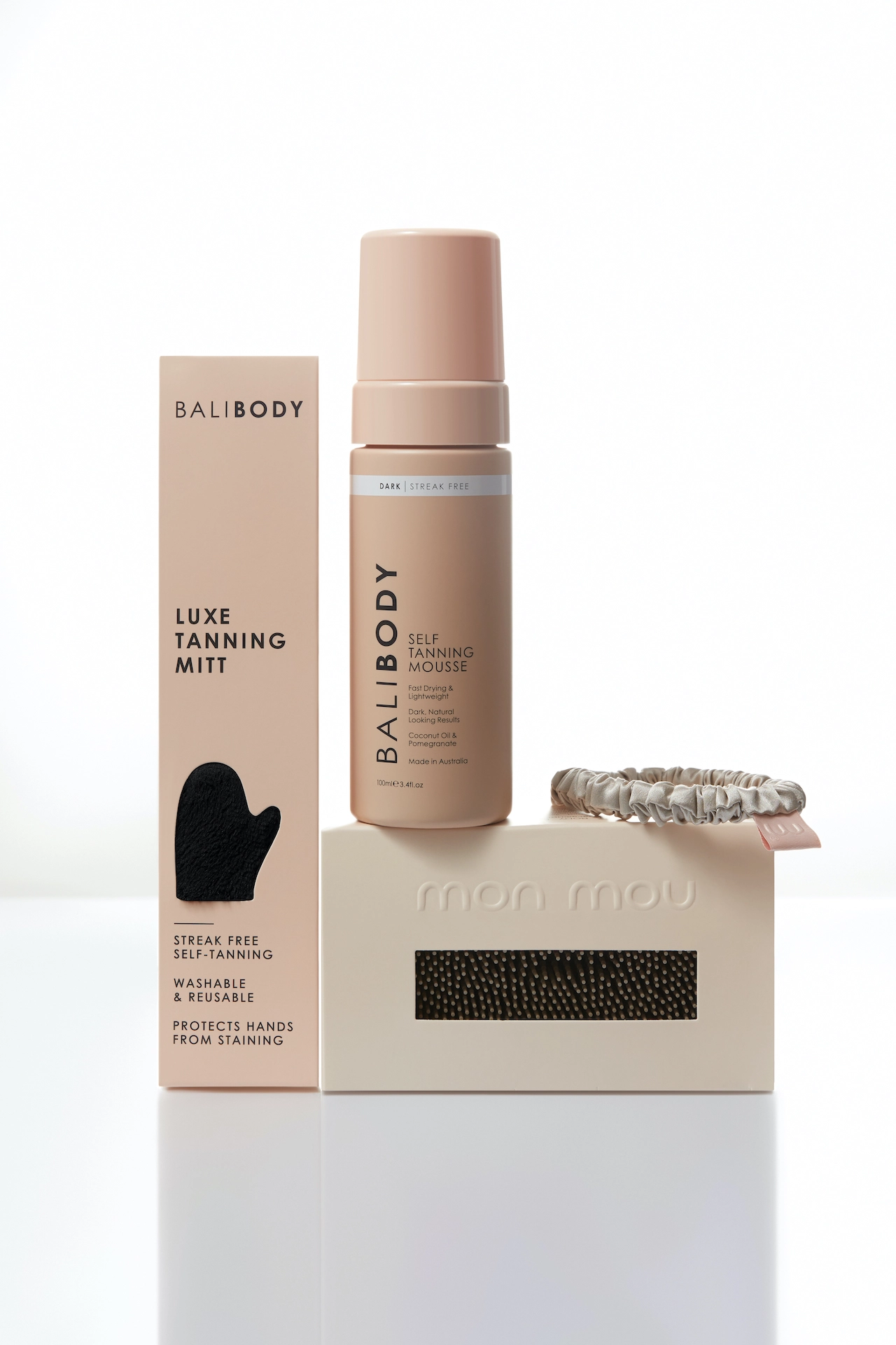 Soft Chocolate Base — це набір від українського бренду шовкових аксесуарів Mon Mou й австралійського косметичного бренду Bali Body. У наборі бренди зібрали усе необхідне для красивої та безпечної засмаги, яку можна отримати вдома за хвилини. Сюди увійшли автозасмага для тіла Self Tanning Mousse та рукавичка для рівномірного нанесення засобу від Bali Body, а також силіконова щітка для тіла і шовкова резинка для волосся від Mon Mou.