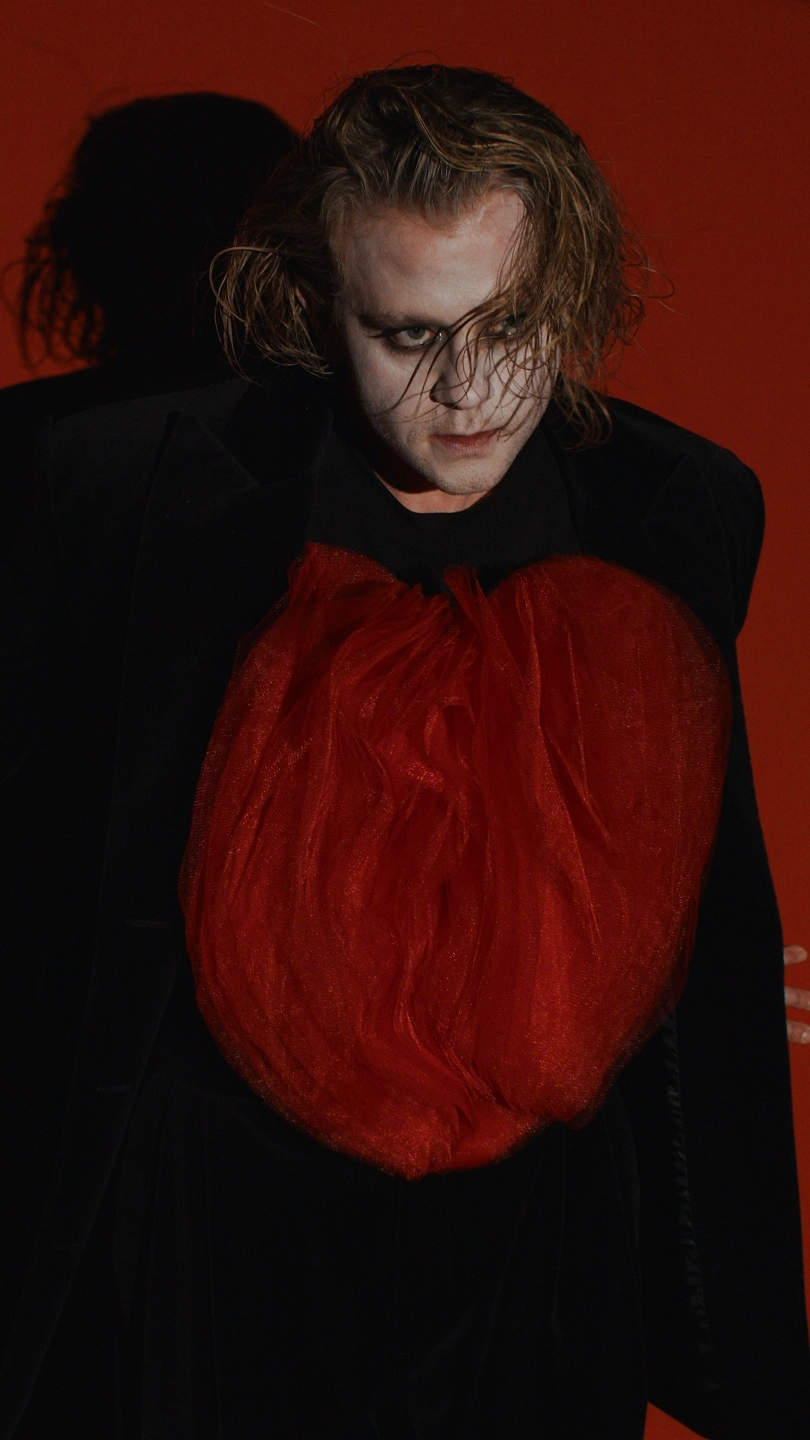 Полупрозрачные ткани и джинс, сердца из фатина и неопрена, объем и многослойность — все это создает визуальную иллюзию, которая оживает благодаря актерским чарам Виталия Ажнова.