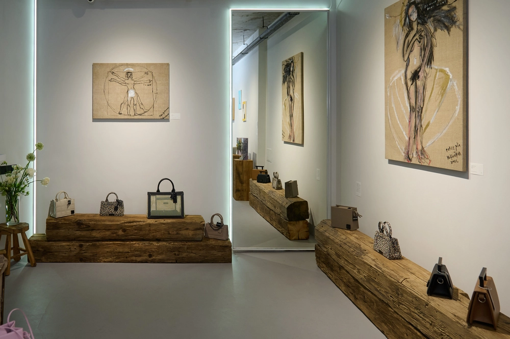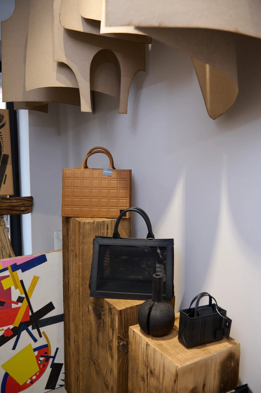 Центром пространства стала небольшая мастерская-лаборатория, где будут рождаться новые модели марки — в диалоге с материалом, формой и идеей. Это продолжение философии Lona Prist — Bag As An Art.